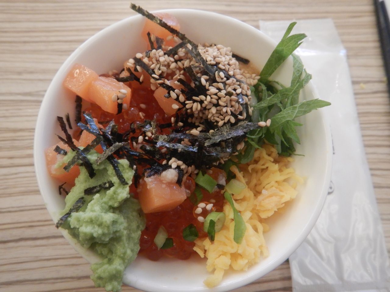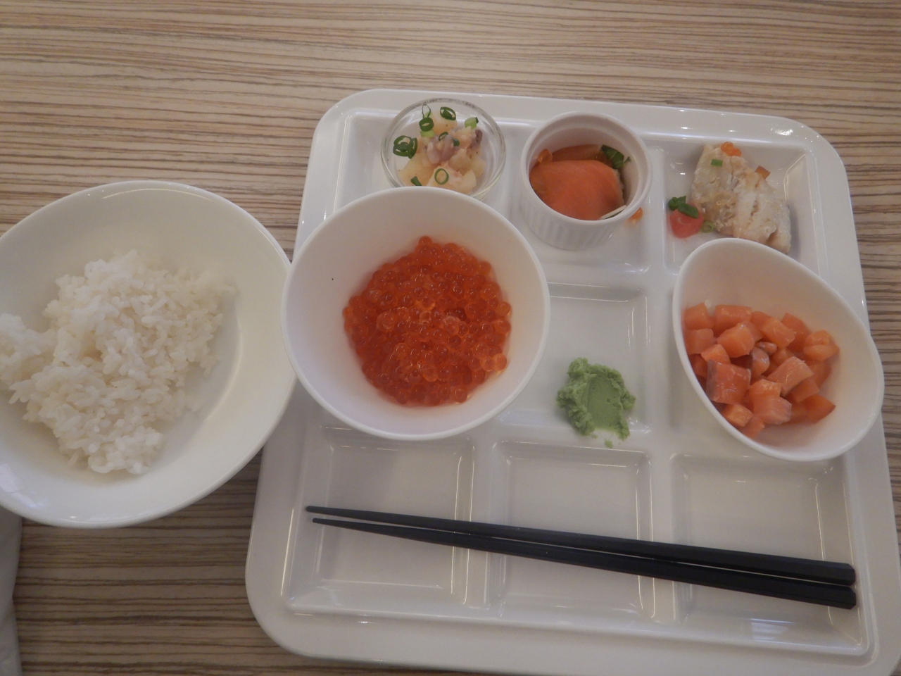 個人的には海鮮丼というよりもイクラが大好きなので、イクラを十分に食べられことに満足した。多くの量を食べられる年齢ではないので、多種類のものを少しづつ食べた。味には十分満足した。このレストランのランチバイキングは「ヨーロピアンフェア」など欧州料理が多いが、今回は珍しく日本の料理が中心だった。- 旅行時期
