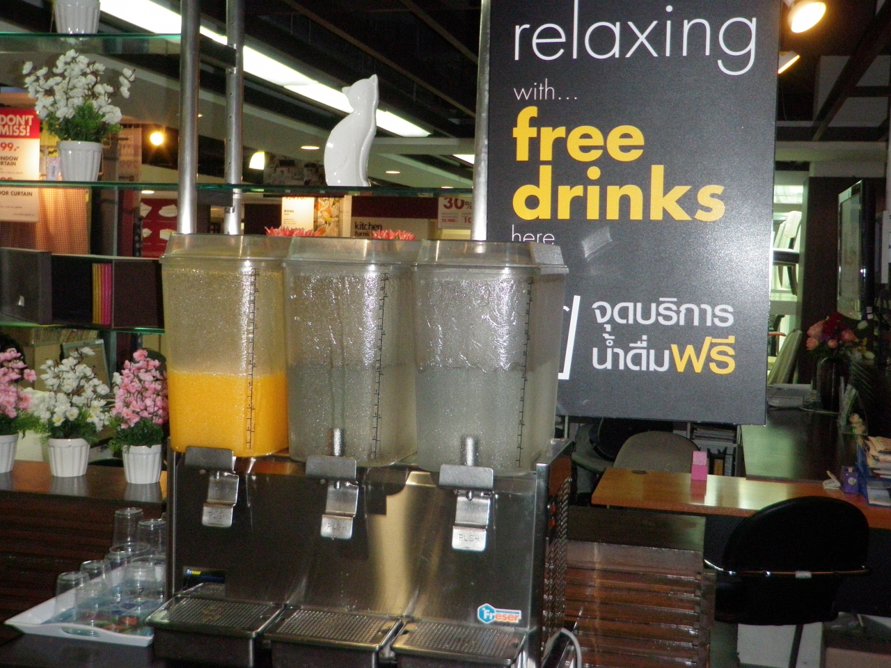5階の奥の家具売り場にフリードリンクのコーナーがある。貧乏バックパッカーの私にはのどが渇いた時、利用している。- 旅行時期
