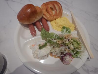 朝食はパン、ソーセージ、スクランブルエッグ、サラダ、ドリンクなど。この宿泊料金で無料で付く朝食なら十分だった。- 旅行時期
