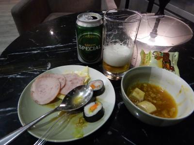 巻きずしやハムなどでビールを飲む。ビール好きにとっては缶ビールではなく、生ビールが欲しいところだが、ぜいたくは言えないかな。- 旅行時期