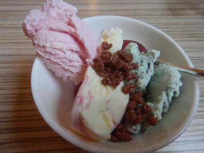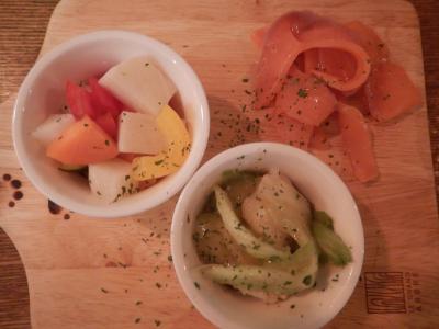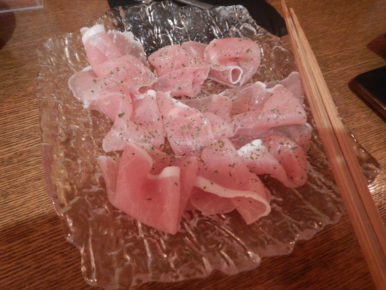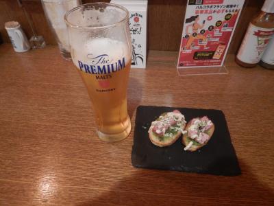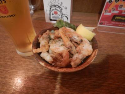 ビールの銘柄はオリオンビールではなく、生のモルツだった。お通しはおいしく食べた。メニューを見て選んだのは小エビのフリッター。これは油切れが悪く、殻付きの海老だったのであまりおいしくなかったので食べきれなかった。カンター席限定メニューといのがあるのに気が付いた。その中から生ハムと前菜3種盛り合わせを注文した。値段も手ごろで(380円、400円+税)おいしかった。- 旅行時期