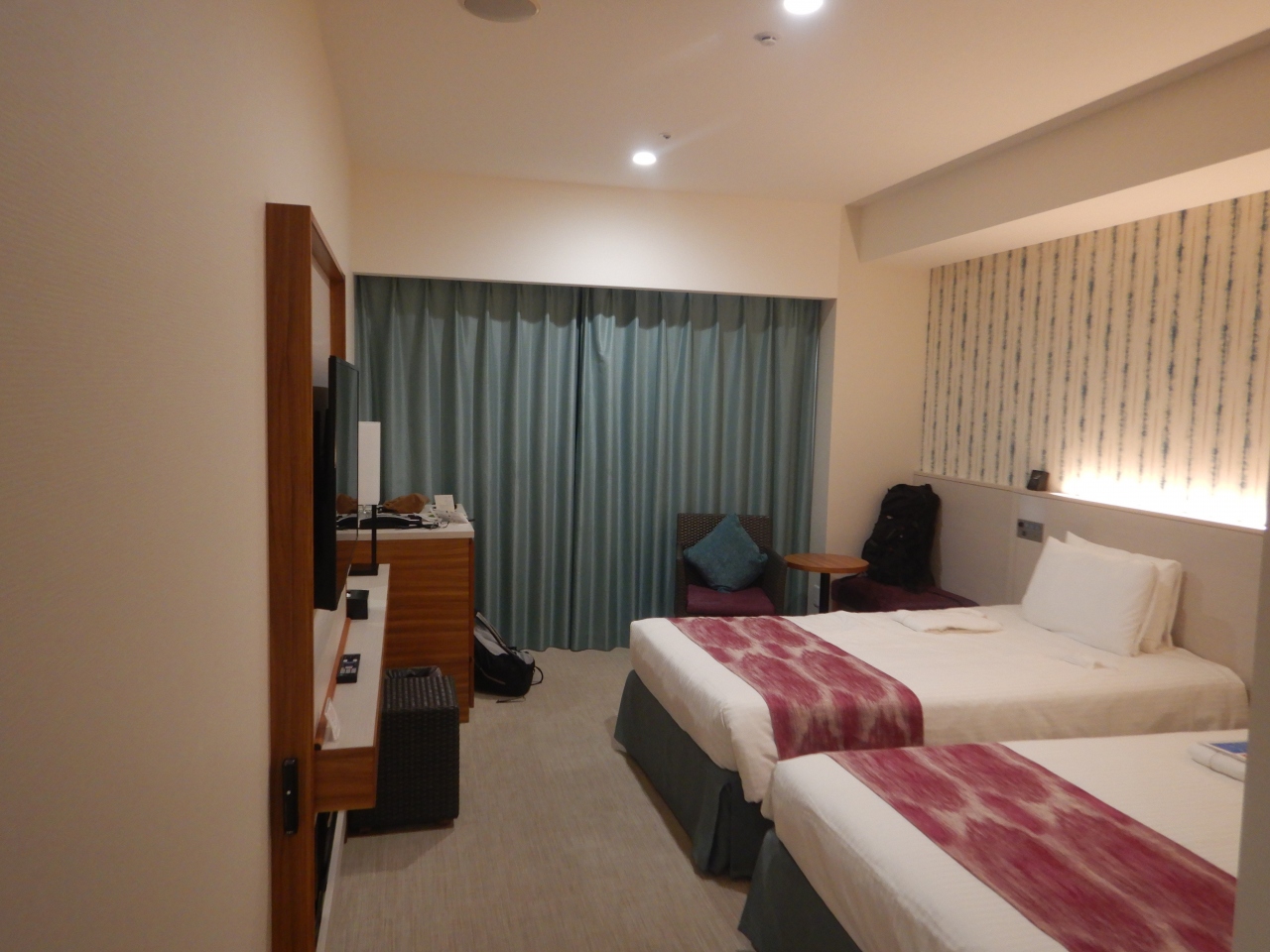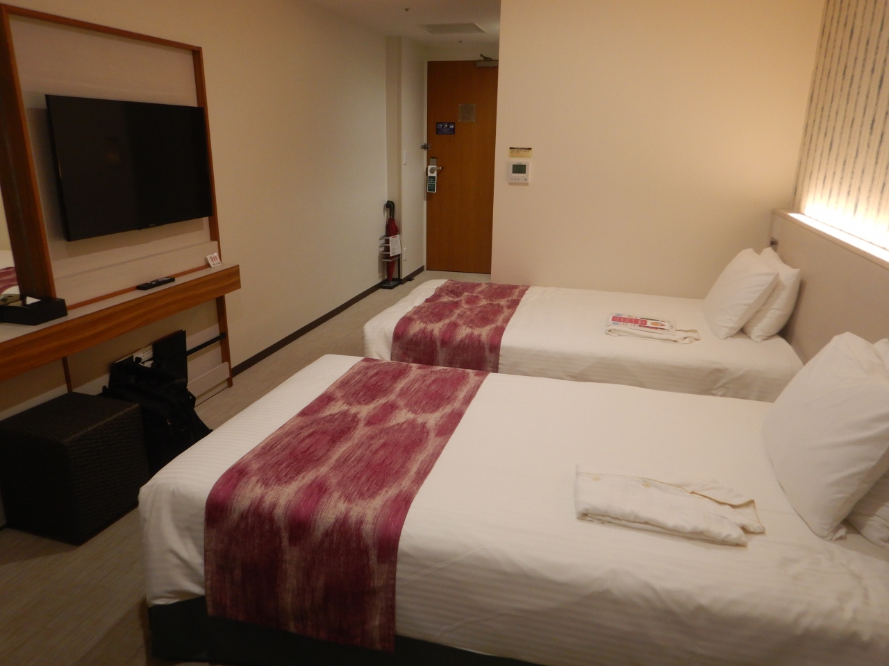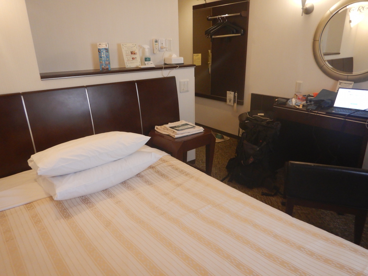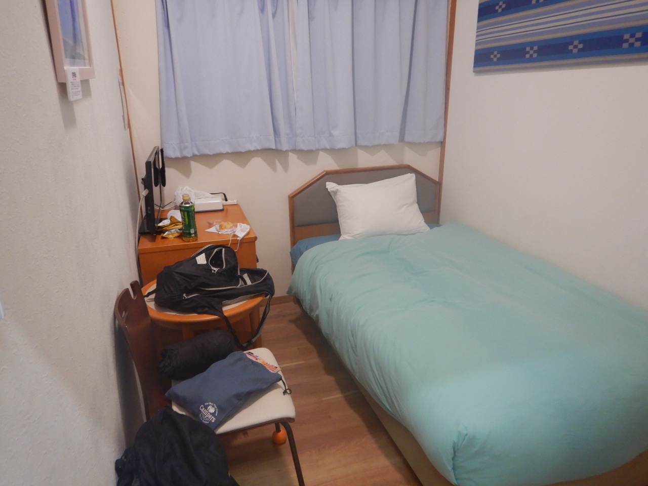 部屋はやや古め。シングルで予約したためか、ベッドは狭い。枕元にコンセントがない。椅子は板張り。冷蔵庫は小さめ。