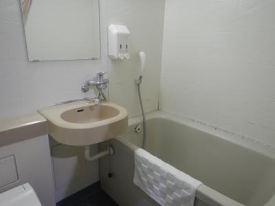 部屋はやや狭め。バスルームのカラン、シャワーは洗面台と共通。バスタブも狭め。