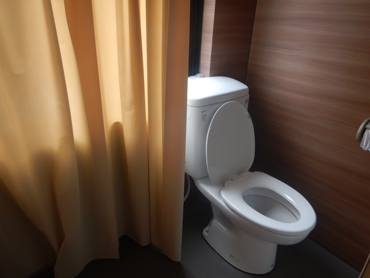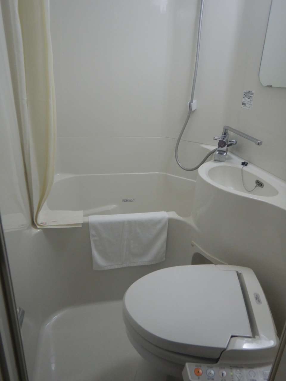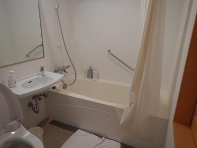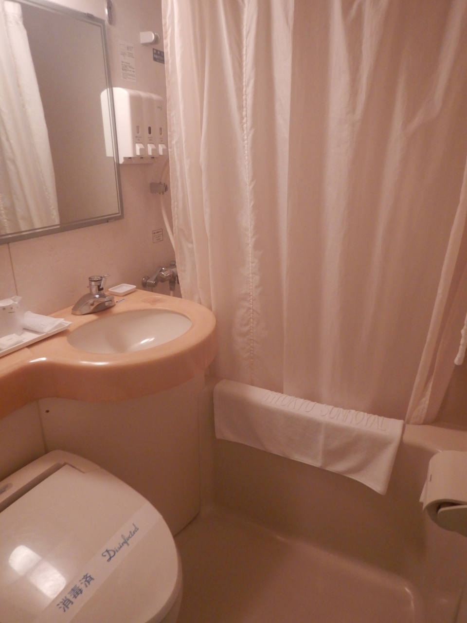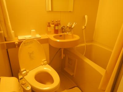 部屋は12平米ぐらいとビジネスホテルホテルによくある広さ。トイレ、バスルームも広くはない。洗面所と湯舟とのカランが一緒のタイプ。