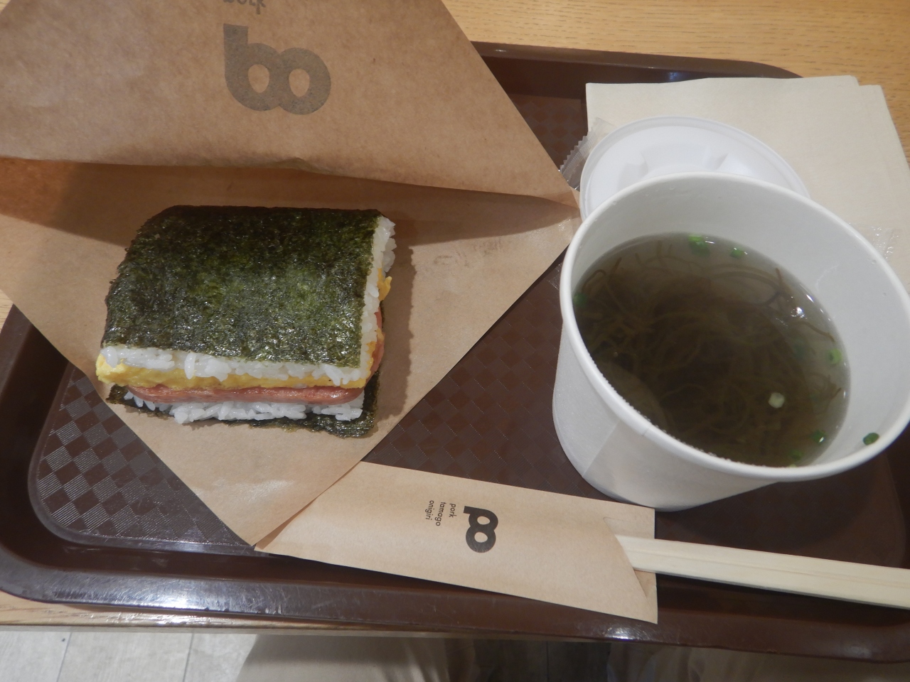 午前9時過ぎに空港に到着。利用しようと思った店がまだ開店していなかったのでポーク玉子を朝食に食べた。大部分の人がテイクアウトする中、イートインコーナーが復活していたので、そこで食べることにした。ポーク玉子は3年前は250円だったものが350円になっていた。モズクスープを確か200円だったような気がするが、350円になっていた。