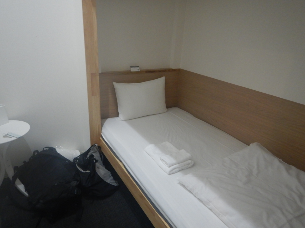 7平米と部屋は狭いが、トイレとシャワー室の上のロフトにベッドがあるので狭さはあまり感じなかった。室内に冷蔵庫テレビばある。アメニティも剃刀以外は一通りそろっている。 マンガが廊下に多数あった。ソフトドリンクが無料で飲める良い。- 旅行時期