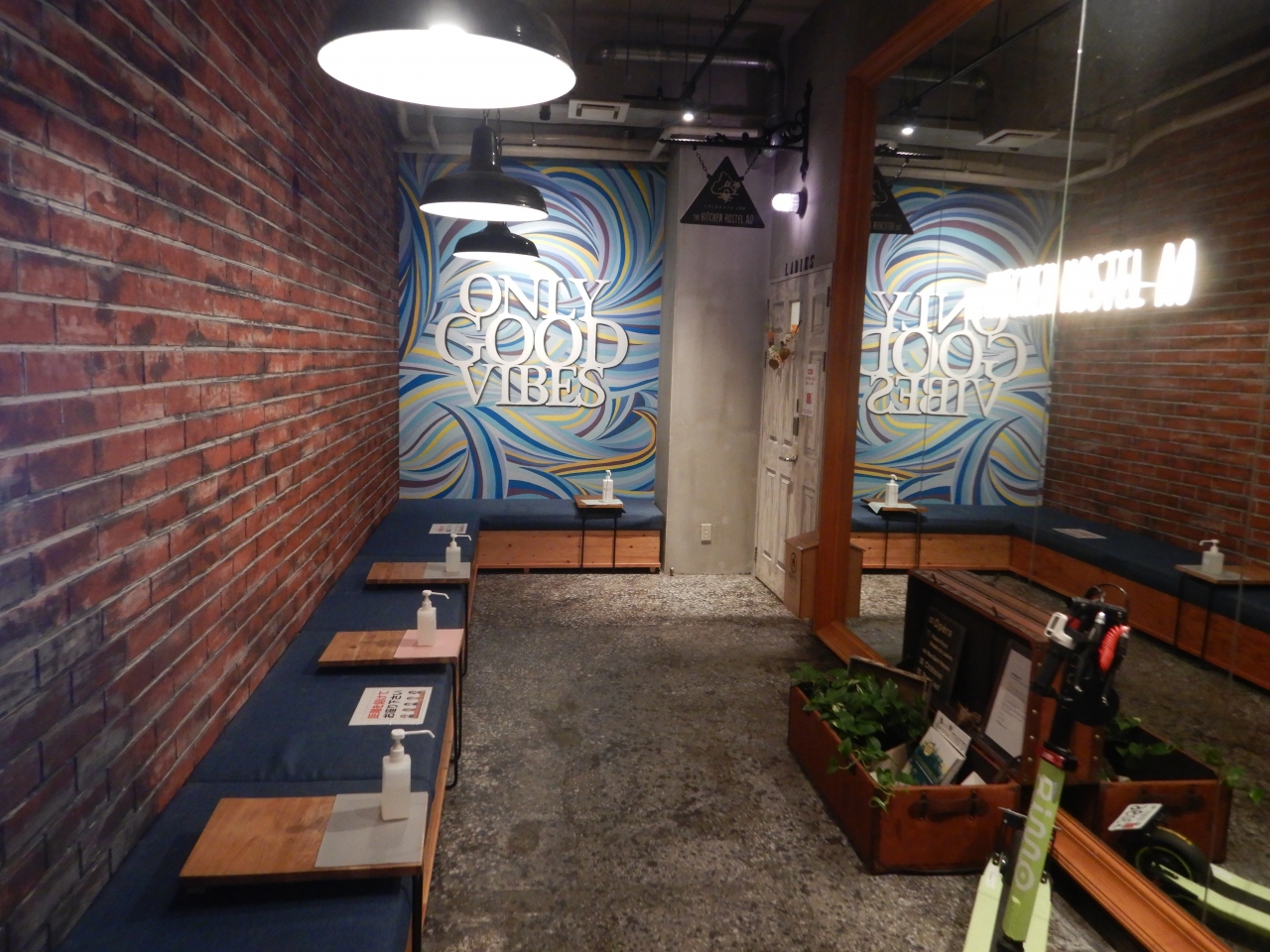 立地は旭橋駅から徒歩10分程度。コンフォートホテルの裏。 1階の居酒屋だったスペースはカフェになっていた。夜は共有スペースになっている。