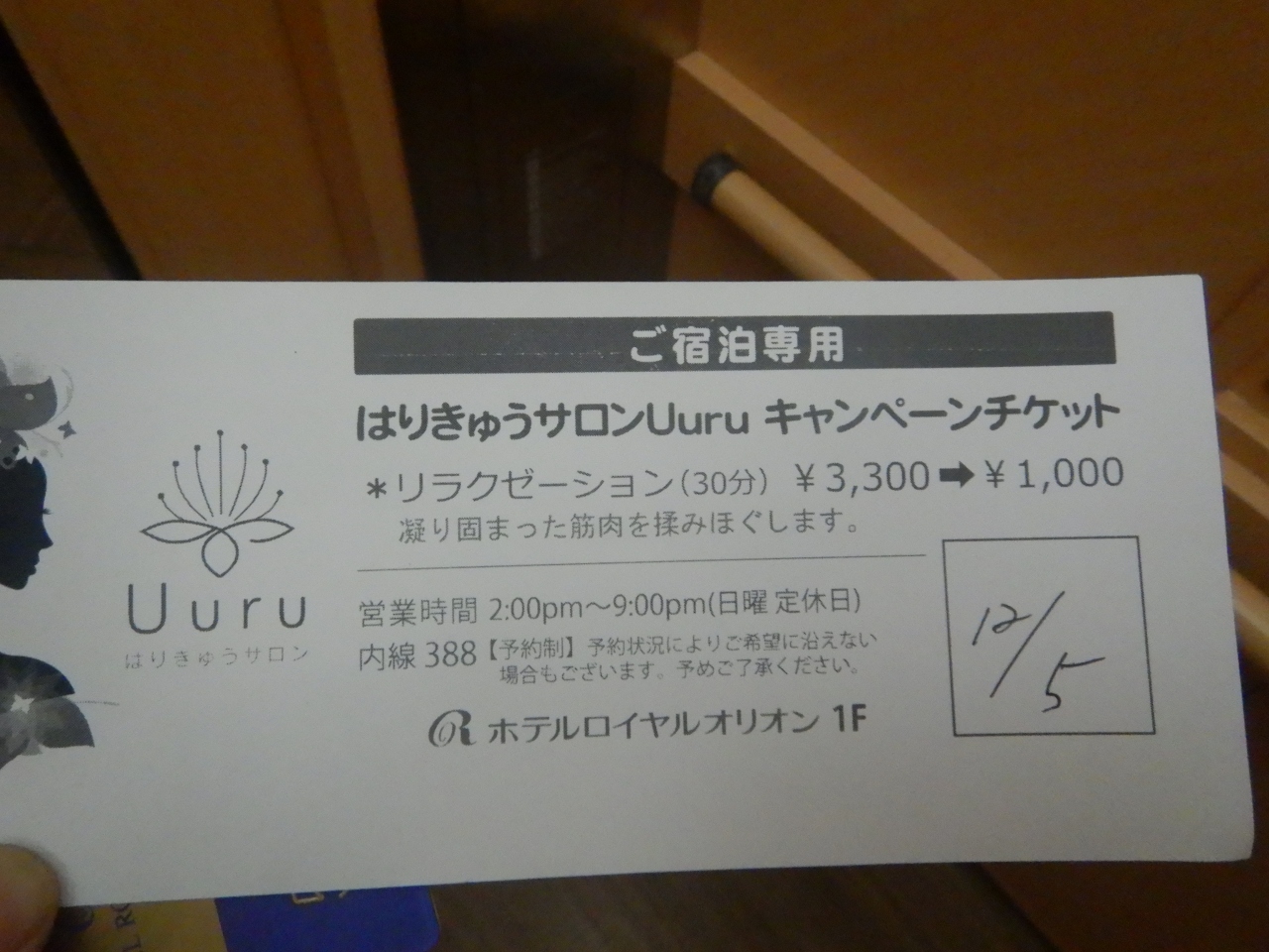 今回は朝食付きで安いプランがあったのでまた宿泊してみた。今回もマッサージの割引券をもらい、地域クーポン券1000円で30分のマッサージを受けた。
