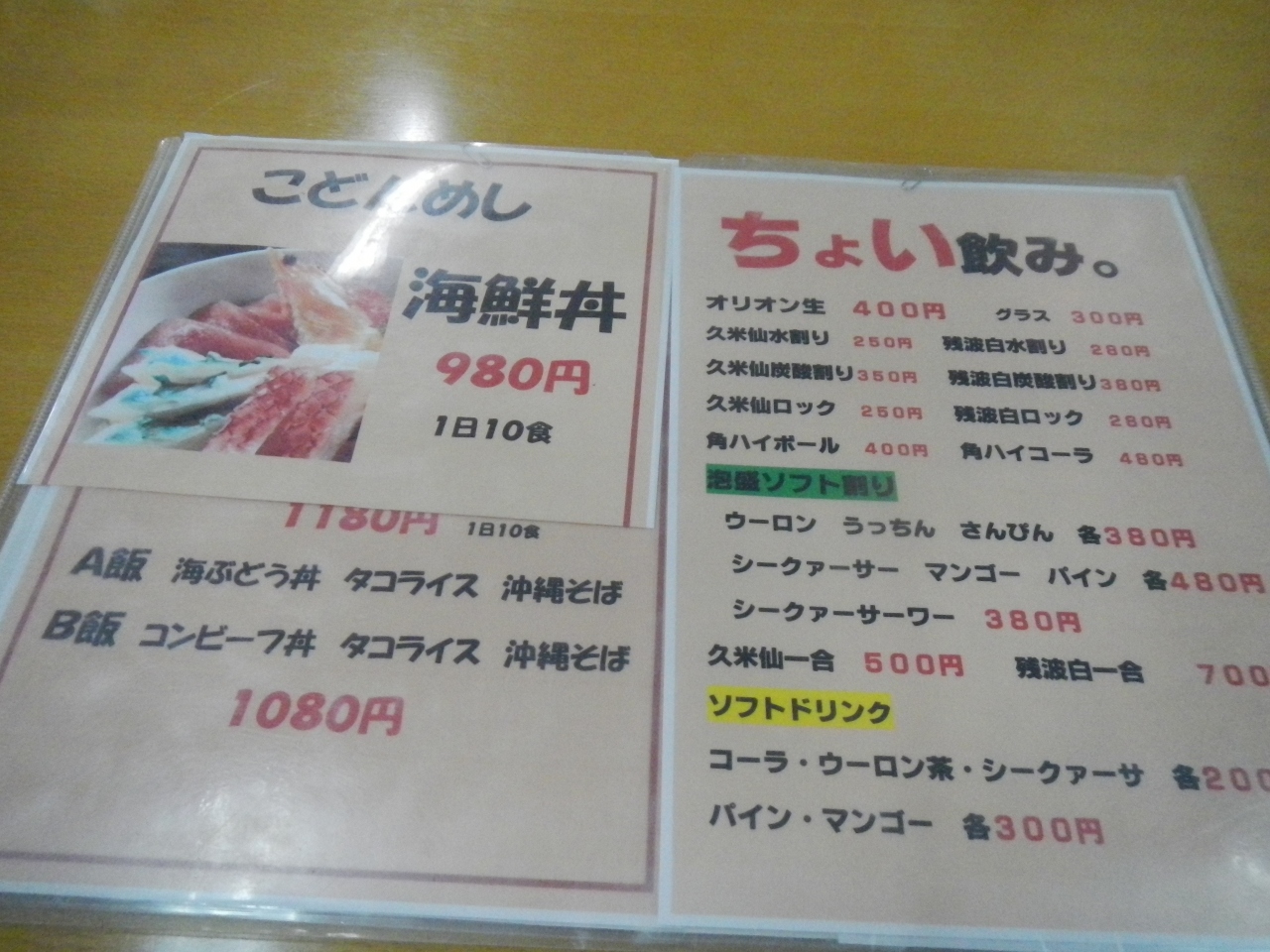 メニューに海鮮丼1日10食限定とあり、 時間は午後3時を過ぎていたので、もうないと思っていたが、聞いてみるとまだあるとのことなので注文した。980円。マグロ、帆手々外、エビ、海ブドウまでは分かるが、あと2品の刺身は何だかわからなかった。値段からするとまずまずだろう。お得とまではいかないが、特に不満はない。