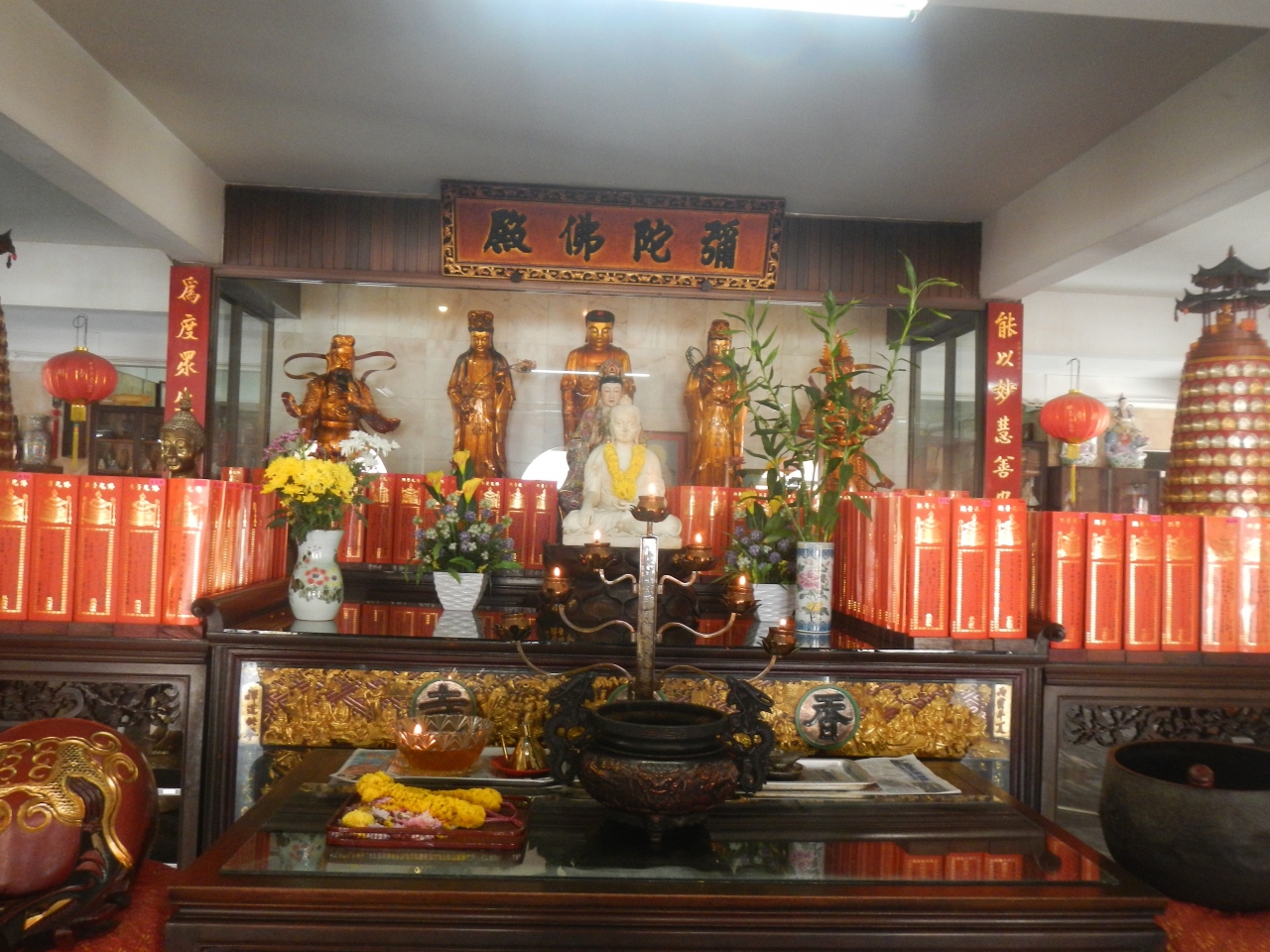 門をくぐり寺院の境内に入ってみた。境内にはお線香を売る場所があり、そこで買ったのだろうお線香をあげてお参りする人がいた。本堂には阿弥陀仏が安置されている。- 旅行時期