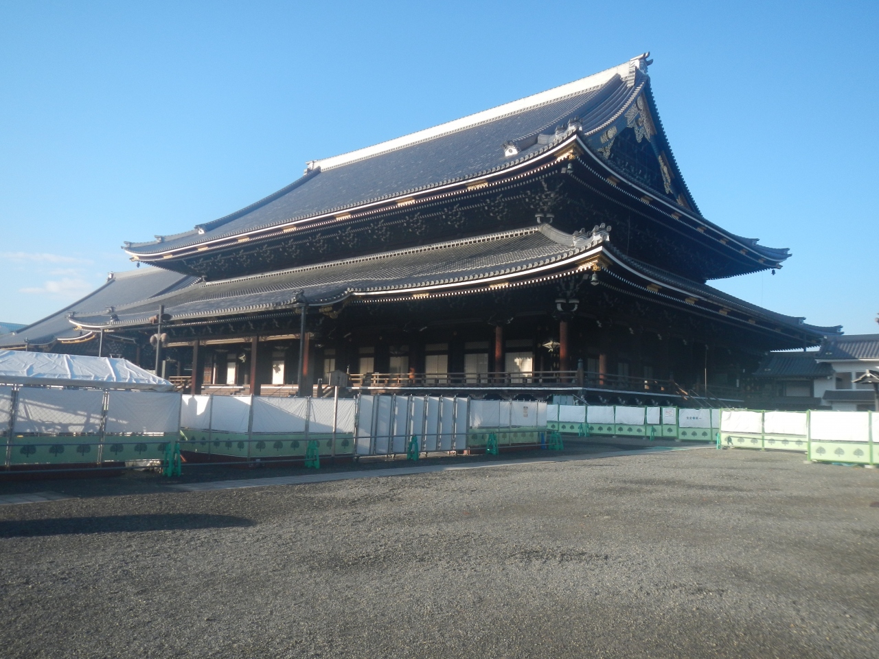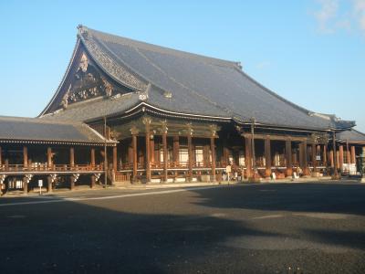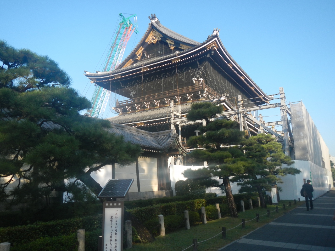 西本願寺から東本願寺と歩いてみた。境内に入る時に使用した門は御影堂門だろうか。修理中だった。さらに境内に入ってみると御影堂も修理中だったので境内を少し歩くだけで終わった。次に渉成園に行こうと思い、開園時間や料金を確認した。
