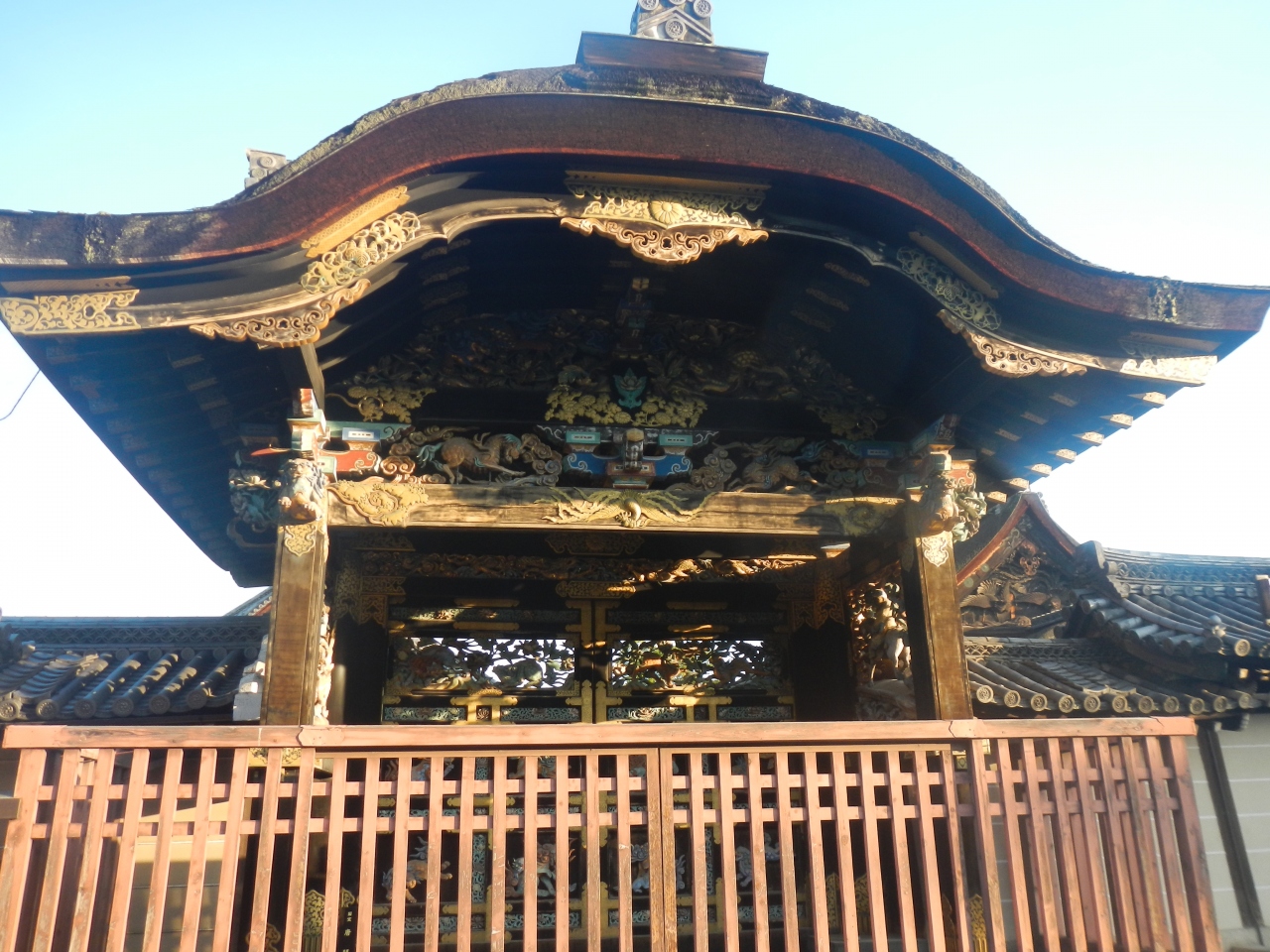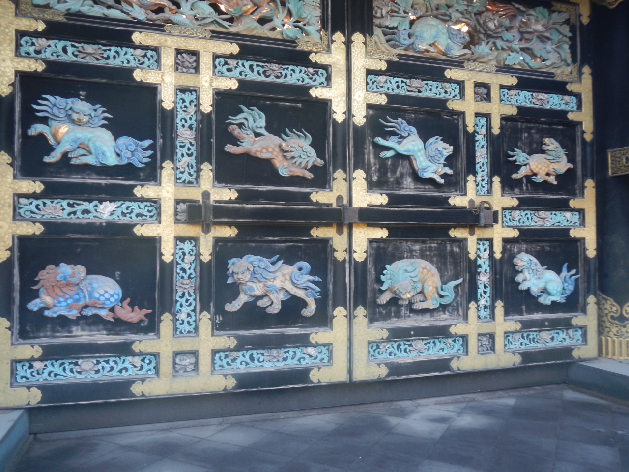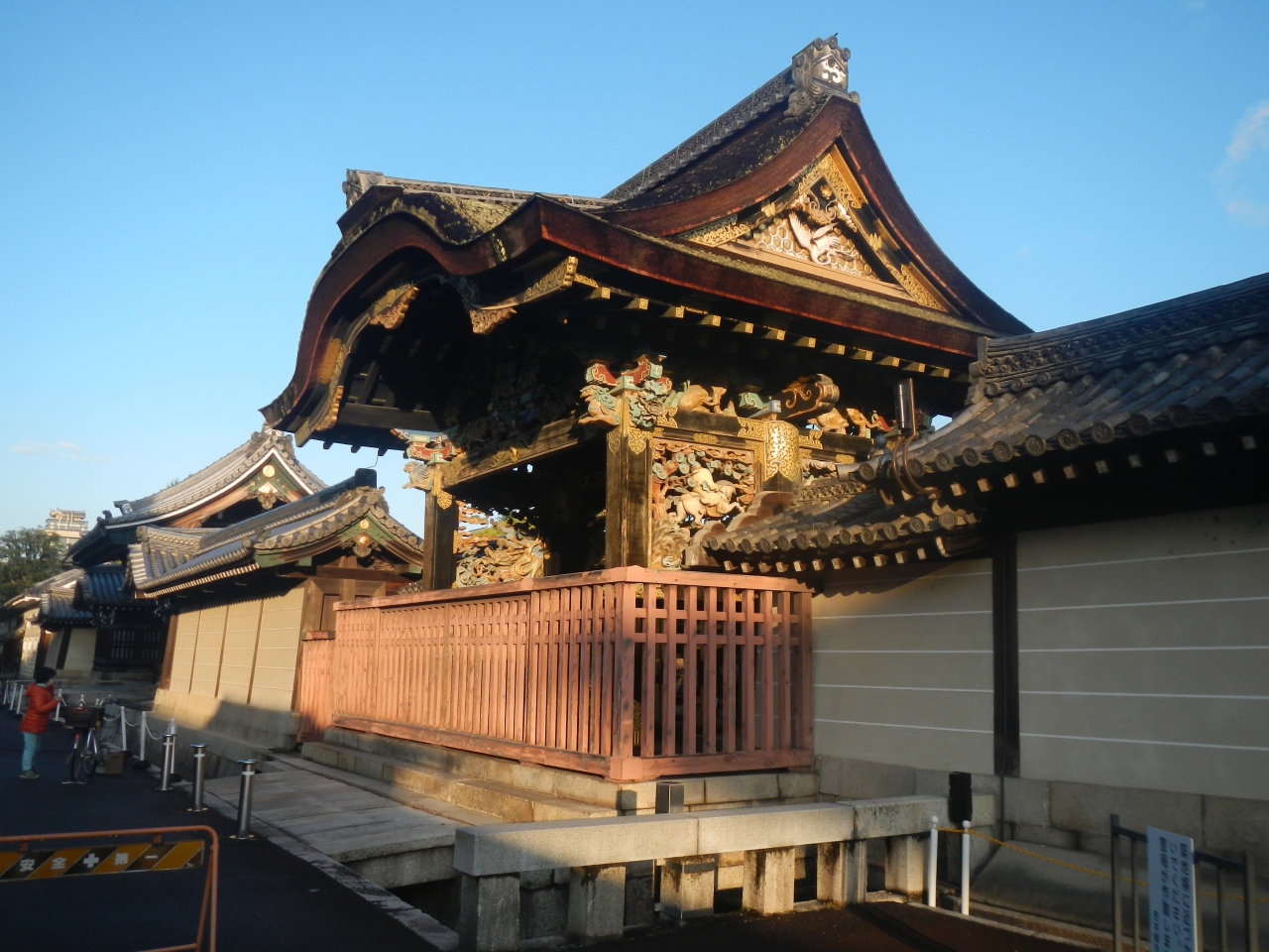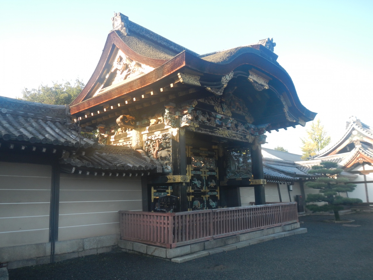 安土桃山文化を代表する建築物。細部まで施された彫刻が素晴らしい。豪華絢爛という言葉が当てはまる。まずは外側から唐門全体を眺める。次に御影堂門から境内に入り、唐門を内側から眺める。門の扉の彫刻は唐獅子だろう。(外側の扉にも彫刻があるが、柵が高く見ずらい)