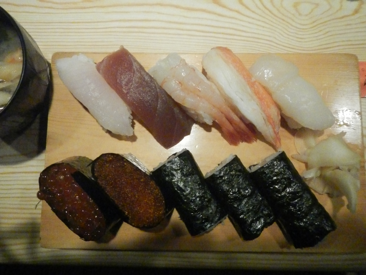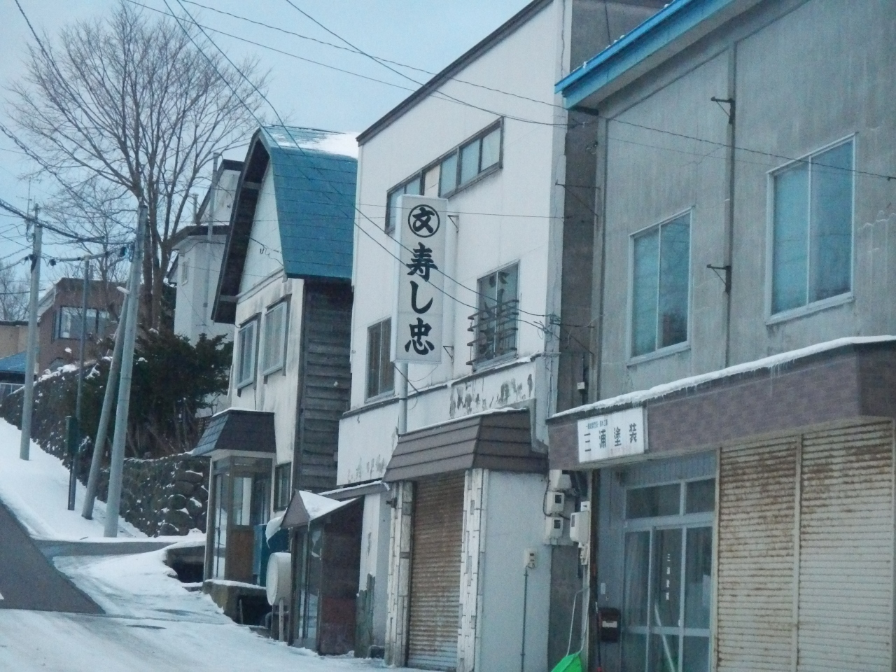 「ぼちぼちいこか増毛館」のご主人に薦められたので行ってみた。場所は宿のすぐそば。増毛駅の向かいにあった。店は70代と思しきご夫婦でやっていた。行った時間が午後6時半と早かったので、お客は私1人。寿司1人前を注文。税別で1300円。写真の通り、寿司7貫と巻物と味噌汁。味の方は特筆すべきことはなく、ごく普通の味だった。
