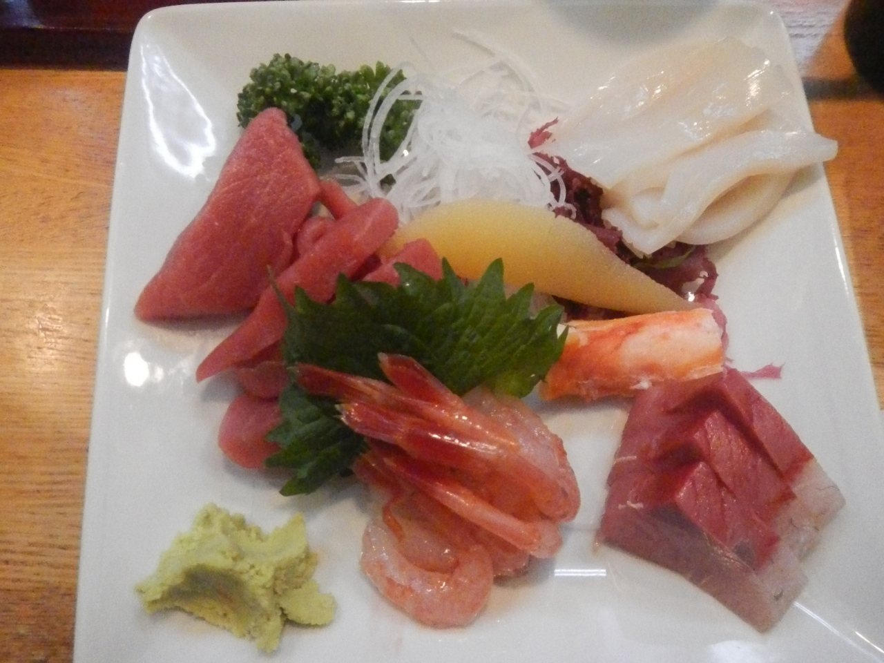 泊まっていた宿のご主人のこの店のお薦めは握り寿司ではなく、チラシ寿司とのことだったが、刺身とビールを注文した。メニューには刺身の盛り合わせが載っていなかったので、、聞いてみると、できるということなので1000円でお願いした。イカ、ハマチ、甘海老、マグロなどが乗っていた。マグロは意外に美味しいので、確認してみたら、生ではなく、解凍したものだった。ビール1杯500円×2、刺身1080円(税込み)だった。- 旅行時期