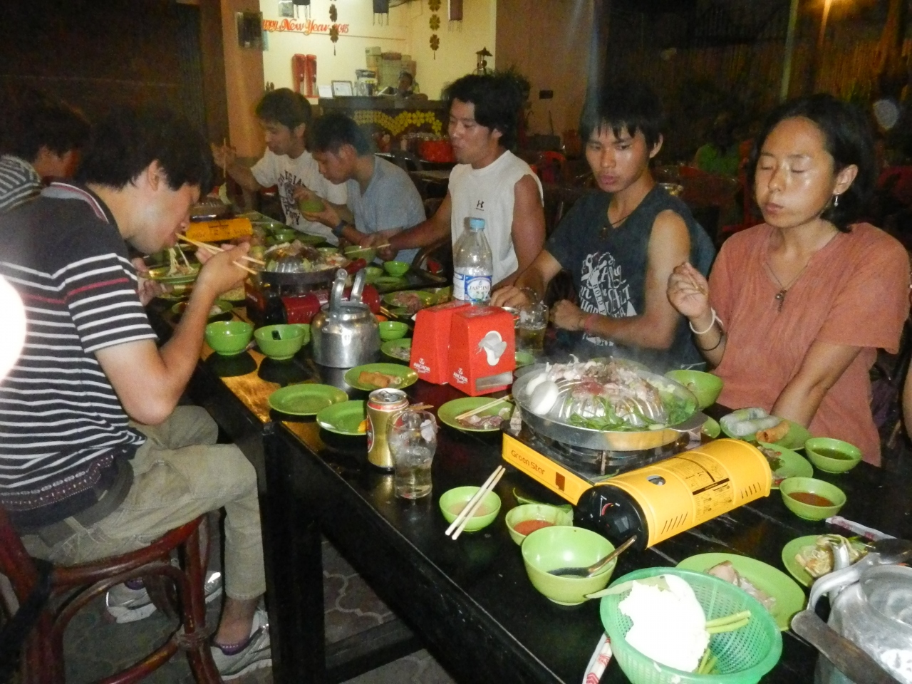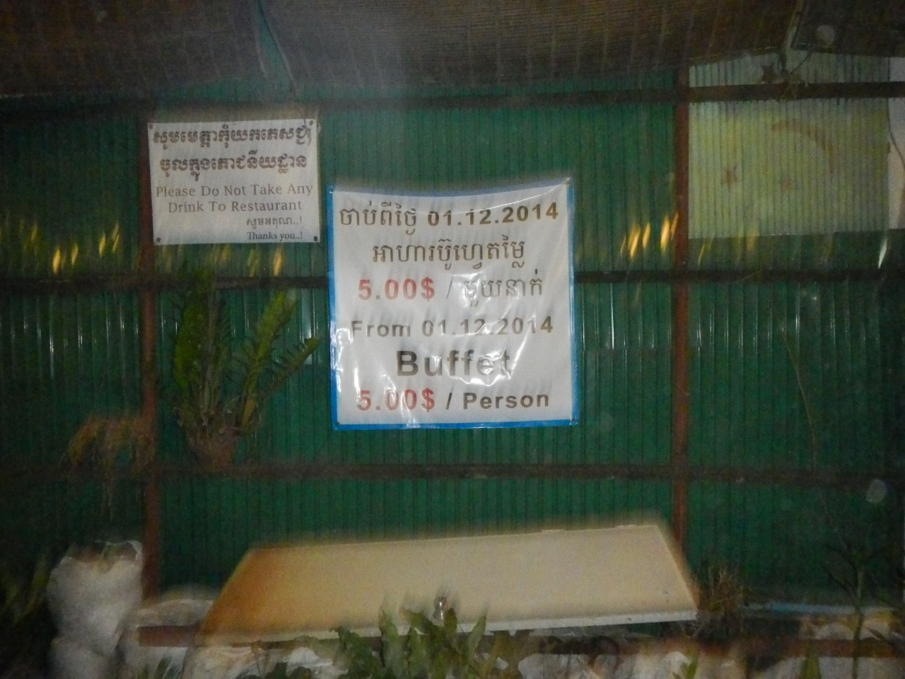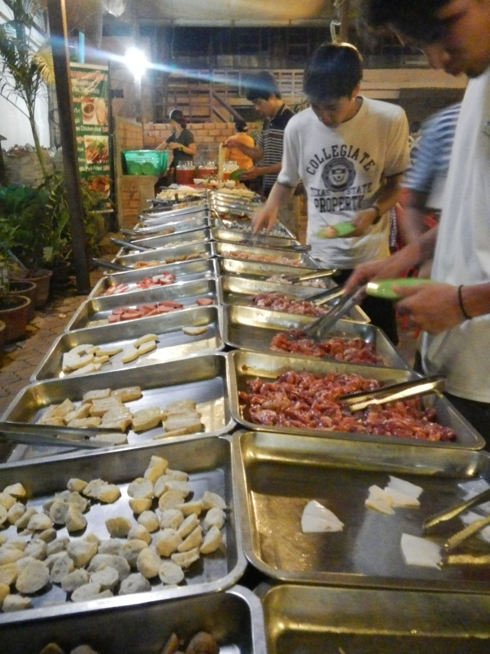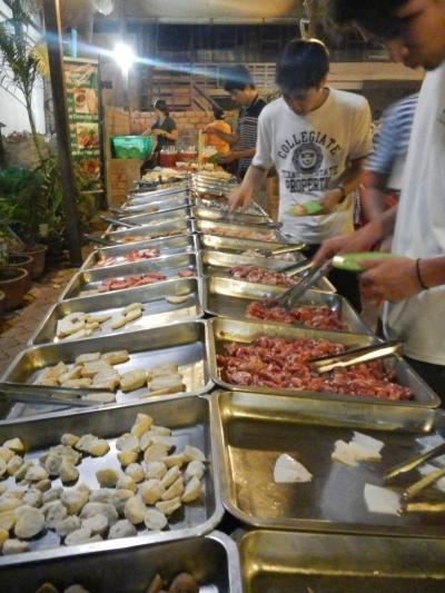 カンボジア式バーベキューの店。5$で食べ放題だ。缶ビールは1本0.75$とリーゾナブルだ。肉、野菜、魚、果物などの具材を自分で取ってきて焼いて(煮て)食べるシステムだ。時間制限はない。ただ、品切れになった具材の補給はなかなかされない。