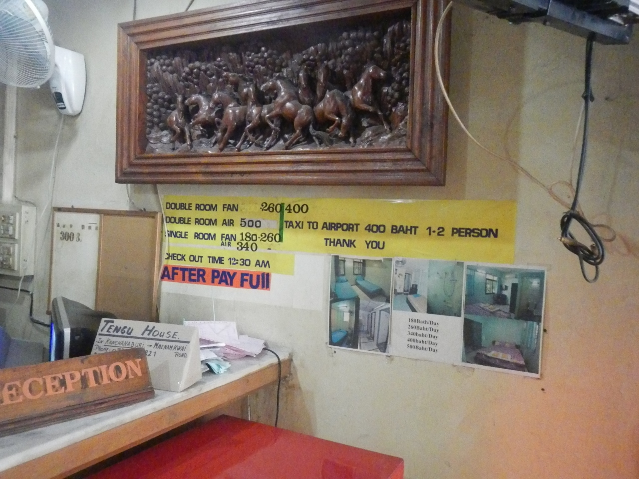 昨年の8月以来の宿泊。今回はファンのシングル、トイレ、シャワー(水のみ)テレビ付の部屋に泊まる。260バーツ。