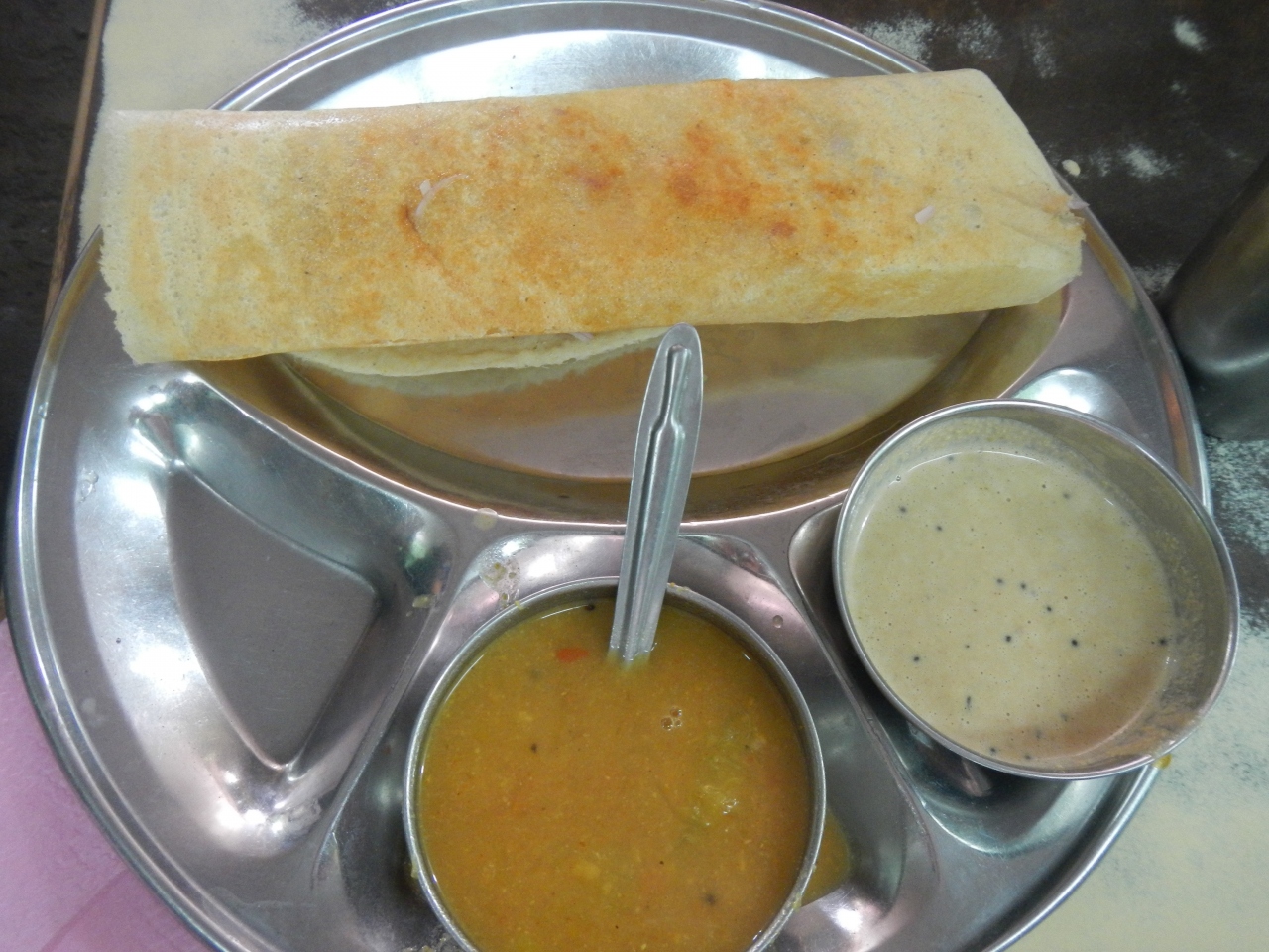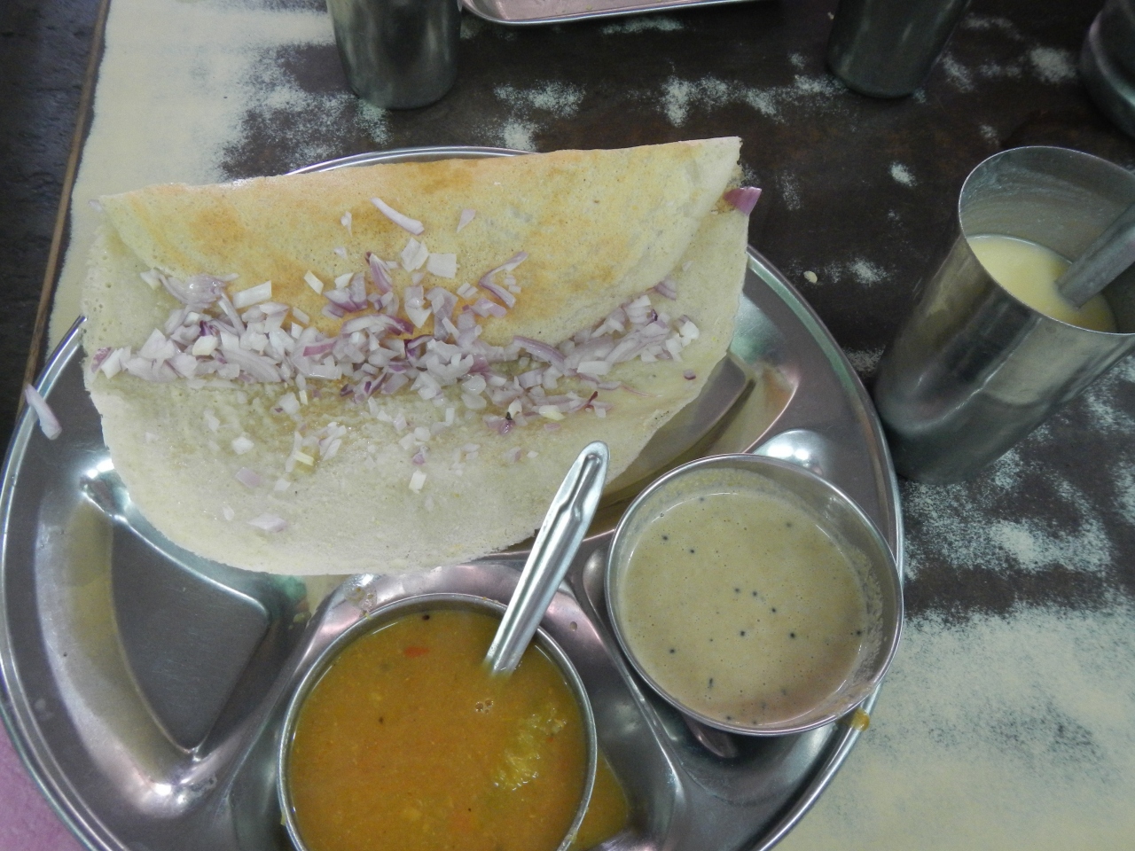ダシャ―シュワメードロードのローカルレストラン。あまり外国人観光客の姿は見られない。カレーやスナック類が手頃な価格で食べることができる。この時はオニオンドーサを食べた。35ルピーだった。