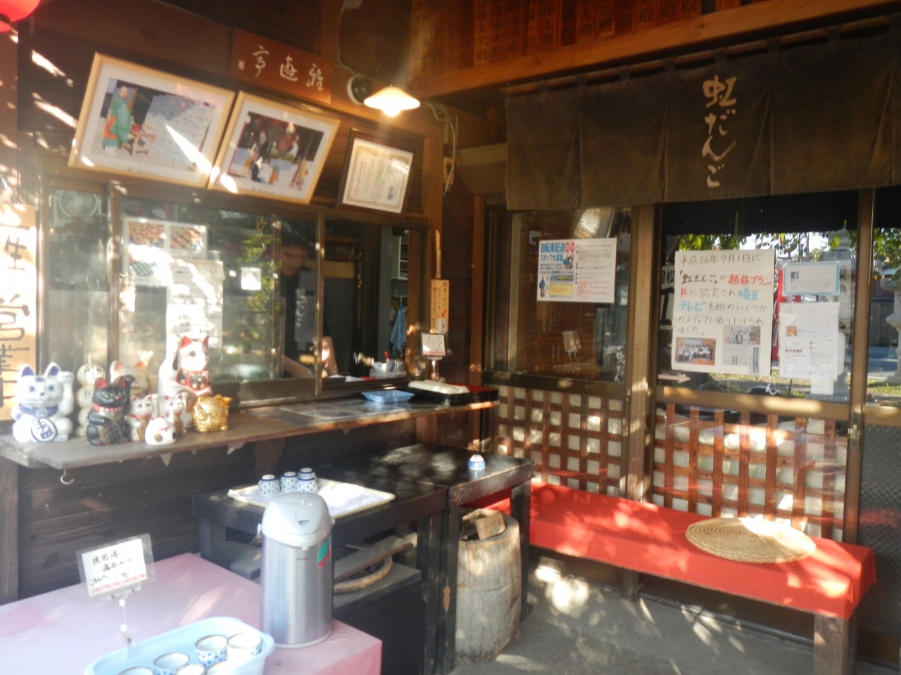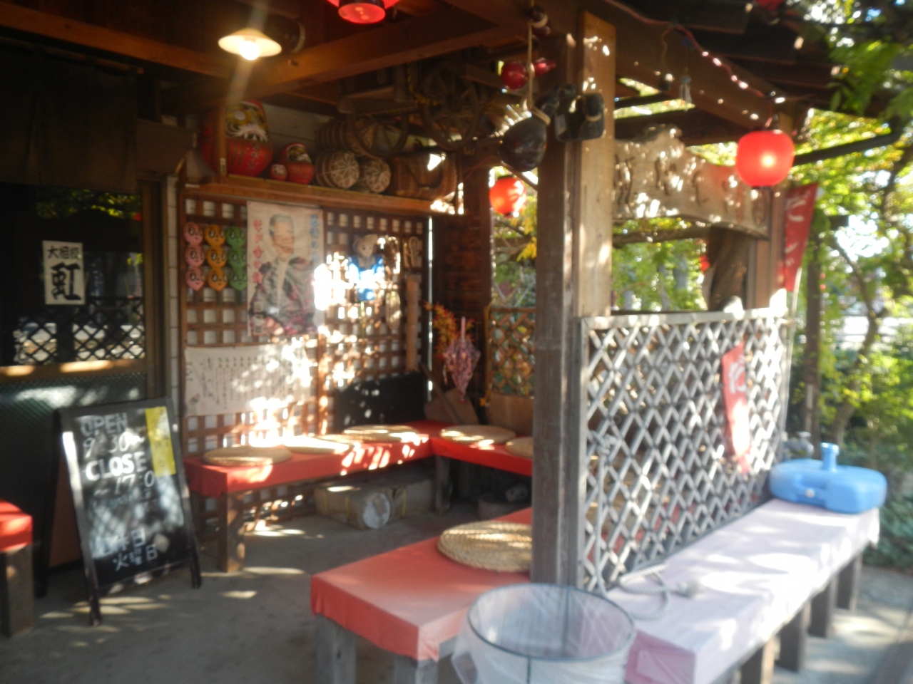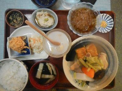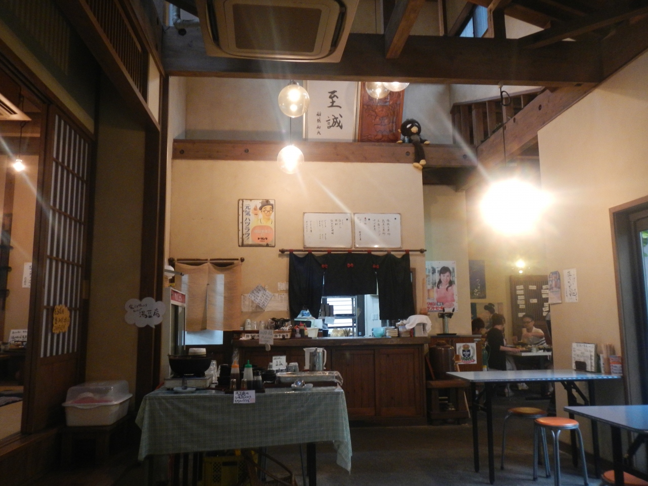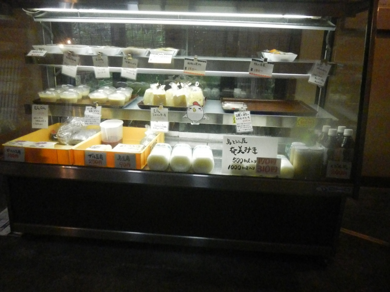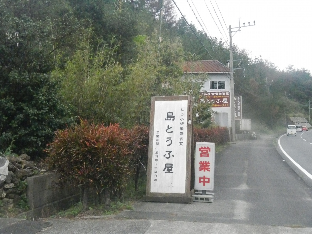 宿の方の迎えに来てもらい、宿に行く途中で立ち寄った店。豆腐屋が経営しているレストラン。店の中央のテーブルに湯豆腐、冷奴、豆乳、ミキが置いてあり無料で食べ、飲むこことができる。