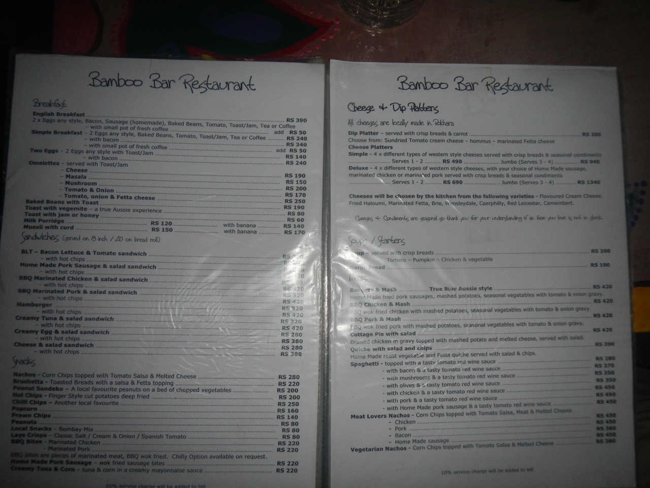 メニューを見るとビールの値段がレストランにしては高くないし、サービス料も取らないので、夜はビールを飲みに来た。ビール290ルピー、ベーコンとほうれん草の炒め物150ルピーだった。- 旅行時期