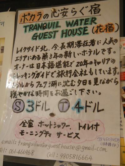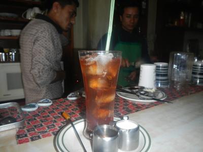 細い路地を入った所にあるのでやや見つけにくい。昼間は2回アイスコーヒーを飲む。100ルピー。店の掲示板にポカラの宿のポスターがあったので、安いから泊まろうと思い、店の人に話したら、店の電話を無料で貸してくれた。なかなか親切だった。
