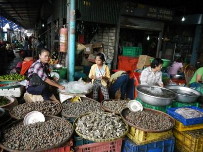 内部は衣類や雑貨を売る店や食べ物の屋台もある。外側は魚、貝、カニ、エビなどの新鮮な海産物を売っている店がある。カニやエビを調理して売っている店があったが、買い方がわからず、買えなかったのが残念だった。- 旅行時期