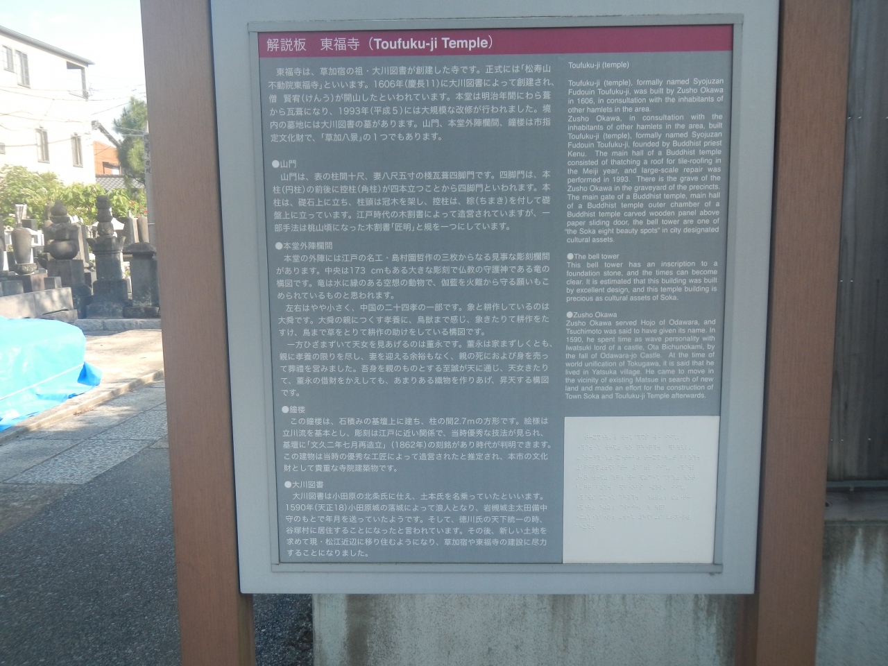 日光街道の草加宿のあたりを歩き、宿場の面影を探していたら、東福寺という寺院に行きあったった。この寺院や草加宿の建設に尽力した人物がこの大川図書ということだ。だからこの寺院に墓があるというこのようだ。
