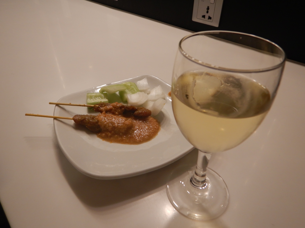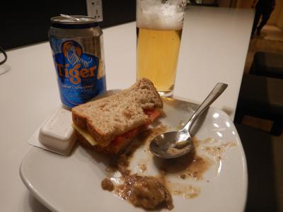 今回もJAL38便、シンガポール発深夜1時50分だ。19時過ぎにラウンジに入り、シャワーを浴びてりして、のんびりと過ごした。5時間近くと長居をしてしまった。料理を適当に取り、ビールを飲む。銘柄はシンガポールのビール、タイガービール。途中でサテをつまみにして、珍しく、ワインを飲んでみた。