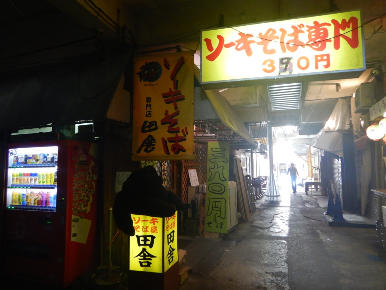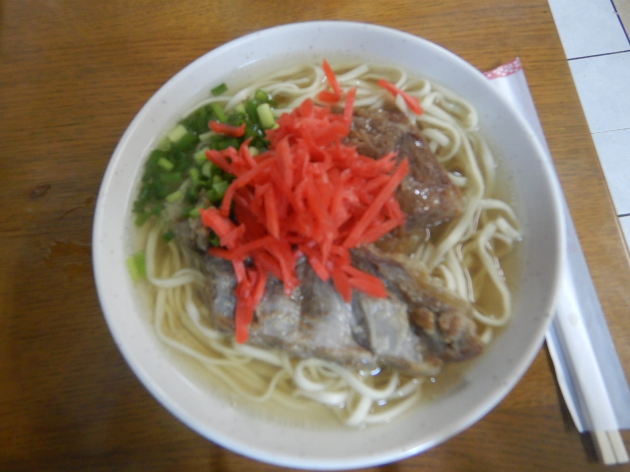 午前10時半頃入店。遅めの朝食としてソーキそばを食べる。注文するとあまり時間はかからず、そばを運んできてくれる。そばと引き換えに代金を払う。そばの上にたっぷりと紅ショウガを乗せて食べる。柔らかに煮込まれたソーキをおいしい。そばつゆには鰹節の出汁が効いている。これで390円は安い。(現在は消費税増税もあって値上がりしている)