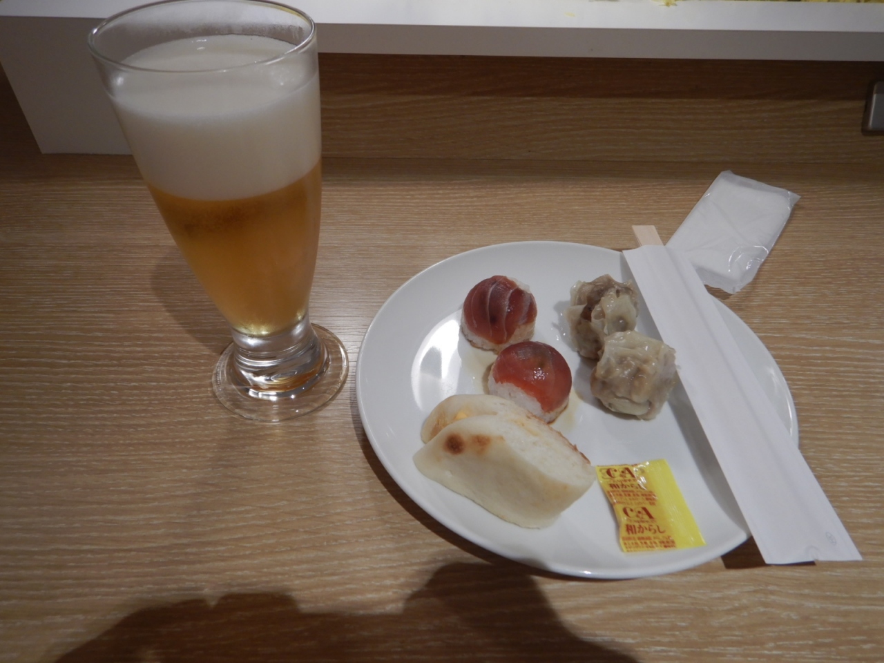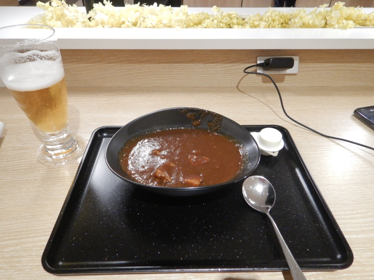 東南アジアに行く時は最近ではJAL33便ばかり利用している。だからいつも同じ内容になってしまう。那覇からの接続便が遅れ、ラウンジの滞在は1時間ほどだった。いつもの通り、手毬寿司やシュウマイでビールを飲む。やはりここでは日本を出国する前のカレーは外せない。