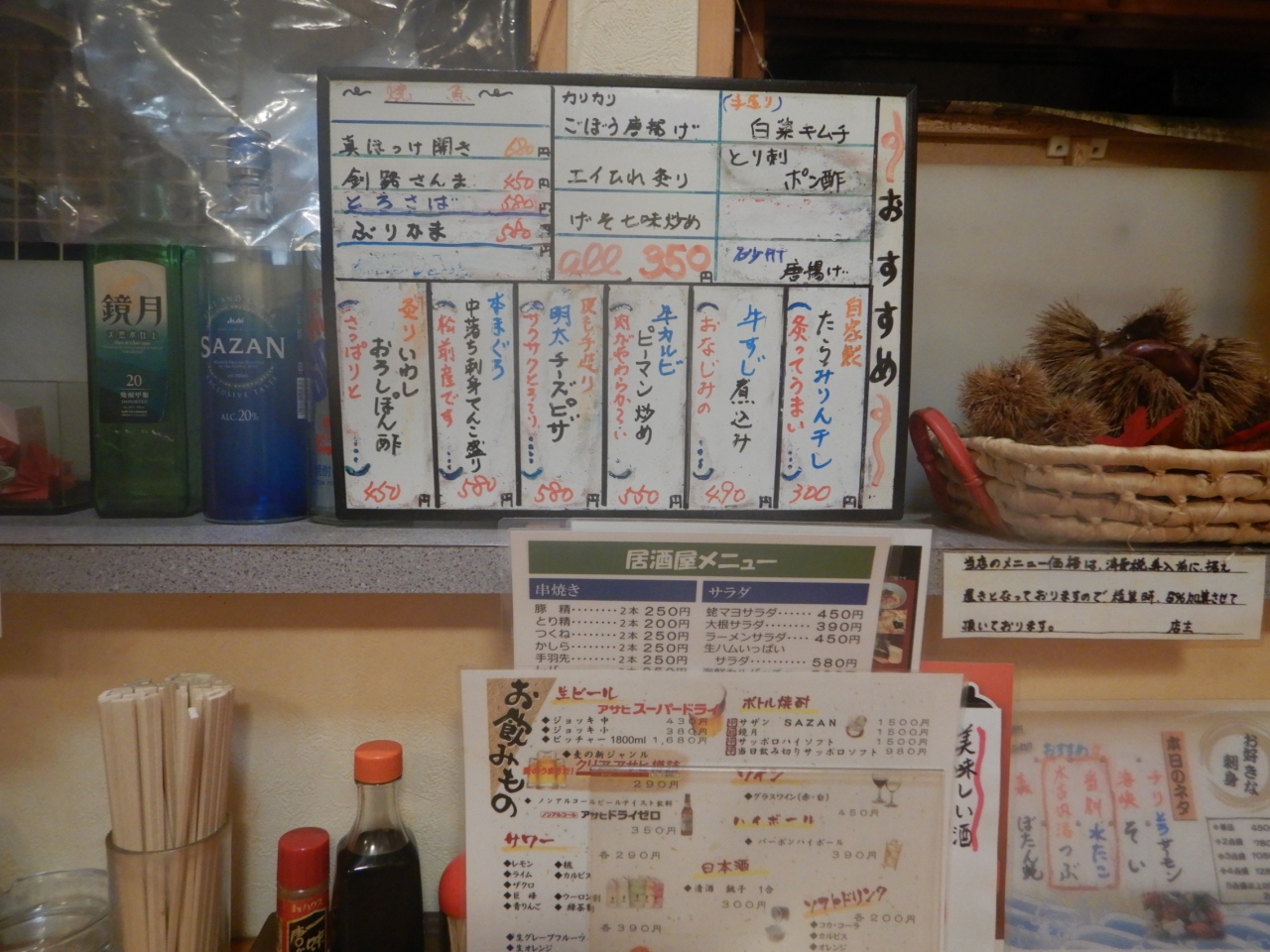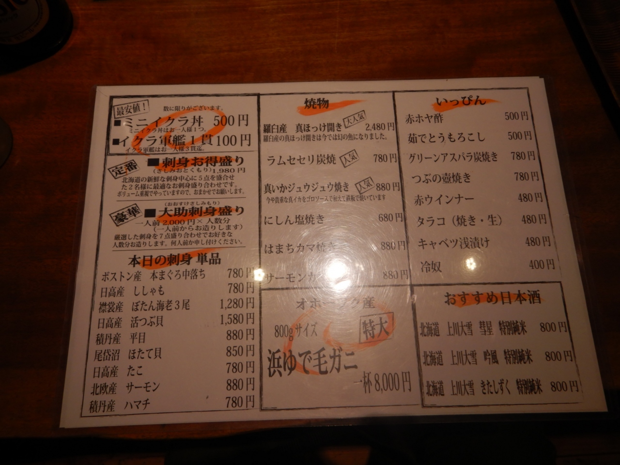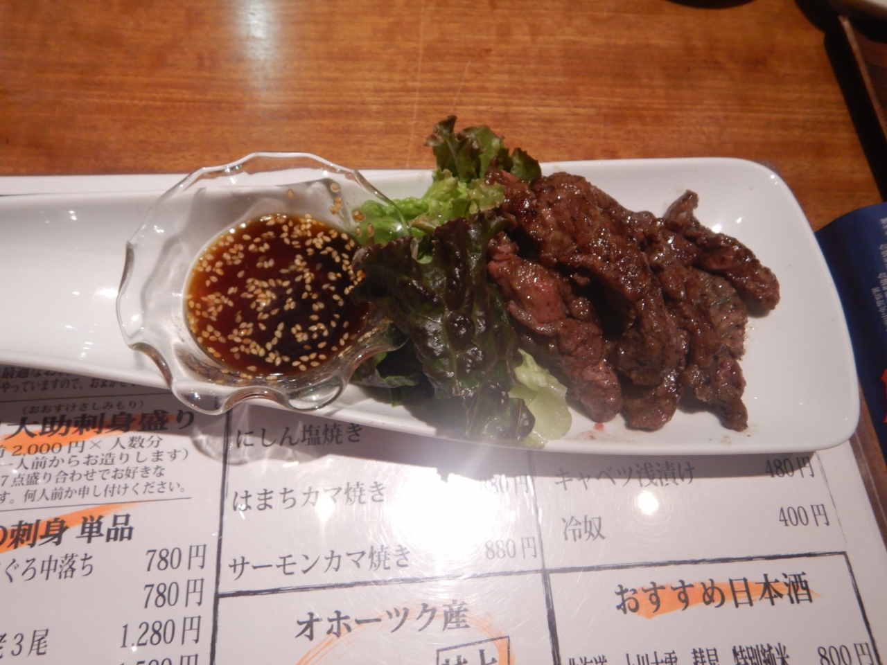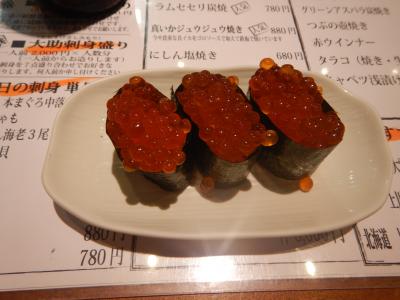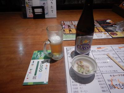 入店し、メニューを見ると生ビールはスーパードライしかないので、瓶ビールのサッポロクラッシックを飲む。ビール1本700円×2、イクラ軍艦300円、ラムセセリ炭焼き780円、お通し400円。計2880円。クーポン券で全額支払い。