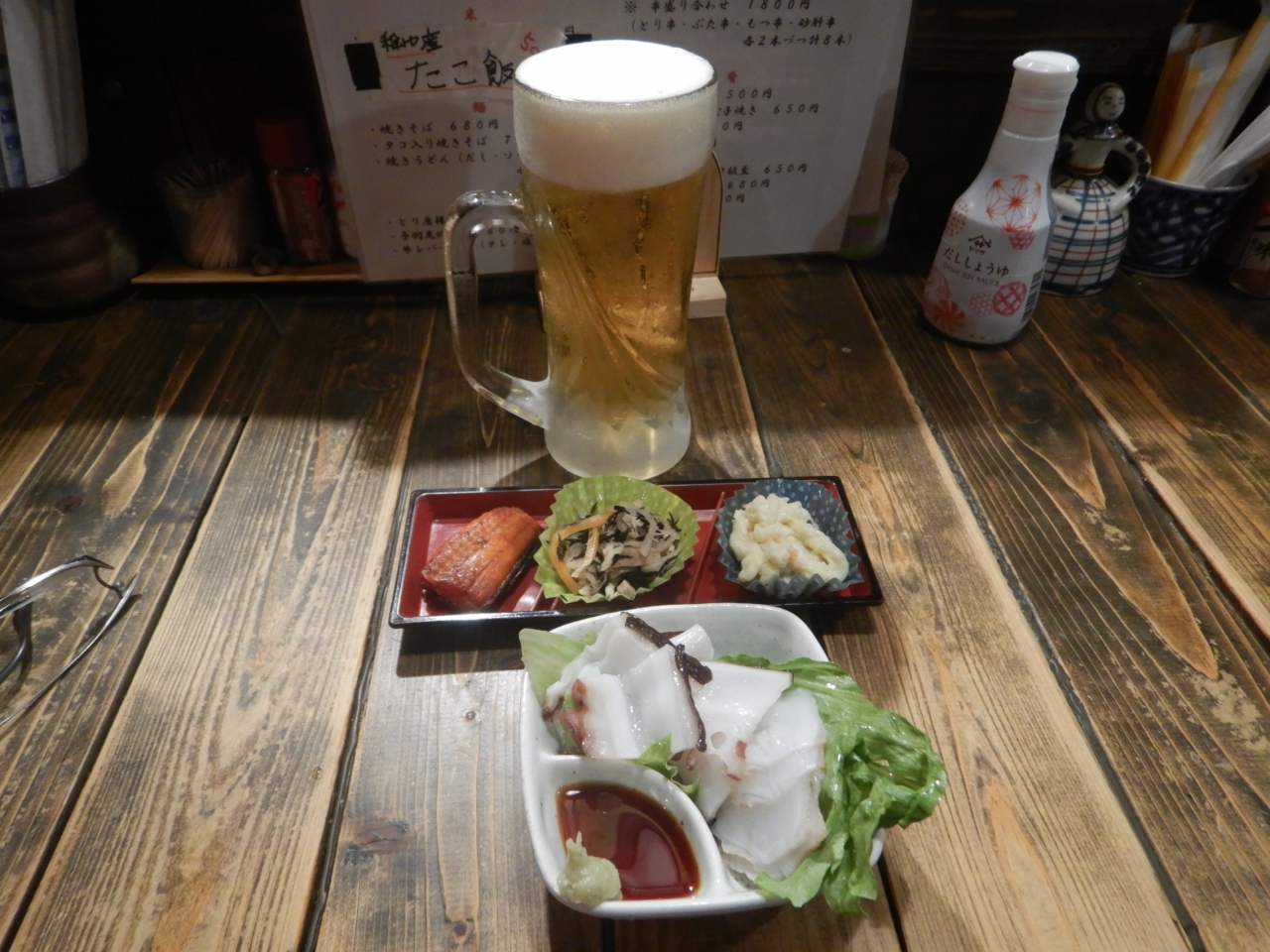 お通し500円、生ビール1杯500円×2、タコ刺し、モズク各500円、計2500円だった。- 旅行時期