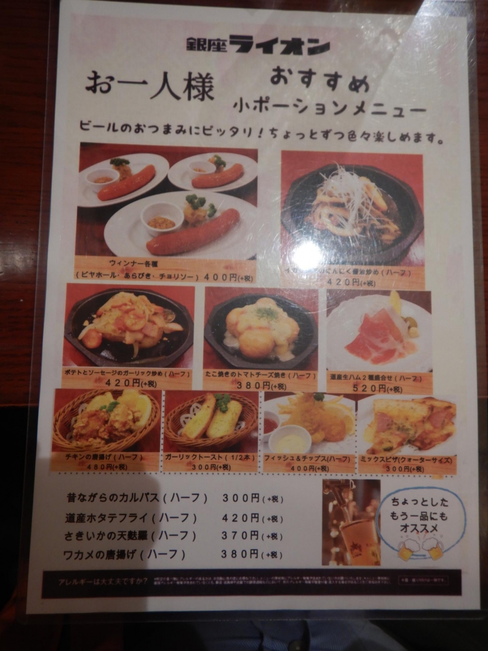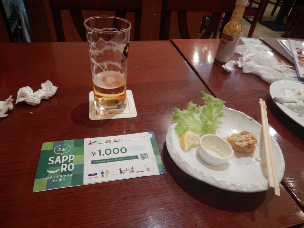 サッポロビールの系列店。サッポロクラシックの生ビールが飲める。飲み放題90分1650円。あらびきウインナーハーフ440円、ポテトソーセージ炒めハーフ462円、ミックスビザ4分の1330円、ホタテフライハーフ462円。計3344円。クーポン券3000円分使用。