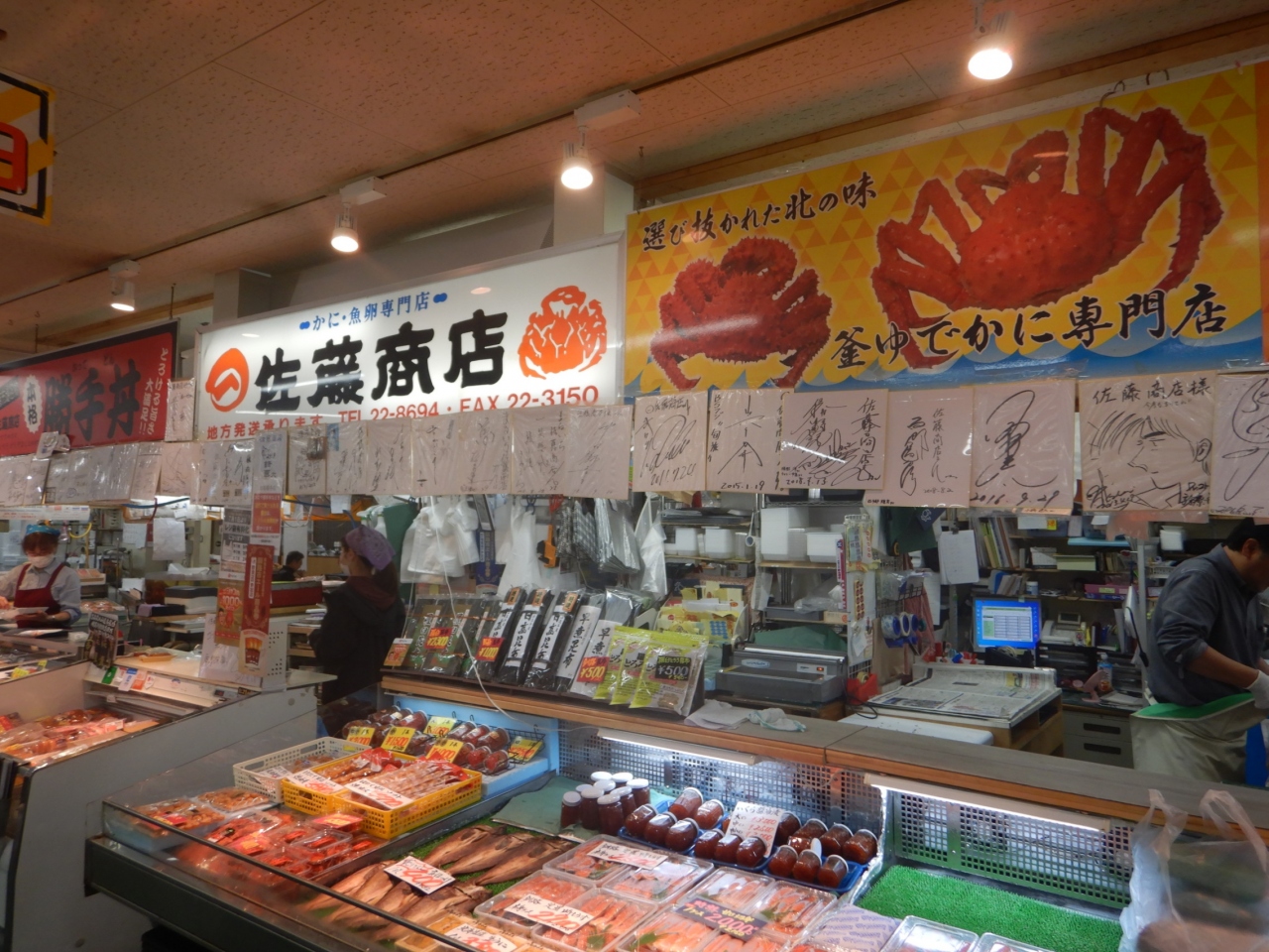 釧路に来たら和商市場は外せない。今回は釧路から成田までの飛行機で帰るので、帰る当日に鮭2匹、花咲ガニ1杯、昆布、ニシンの切り込み、タラコを買い、自宅に配送してもらった。他の店で買ったものを一か所の店でまとめて配送してもらることができる。送料を含めて1万円以上もつかってしまった。この時買った鮭はまだ冷凍室の残っている。(写真は帰る前日の下見の時に撮ったもの)