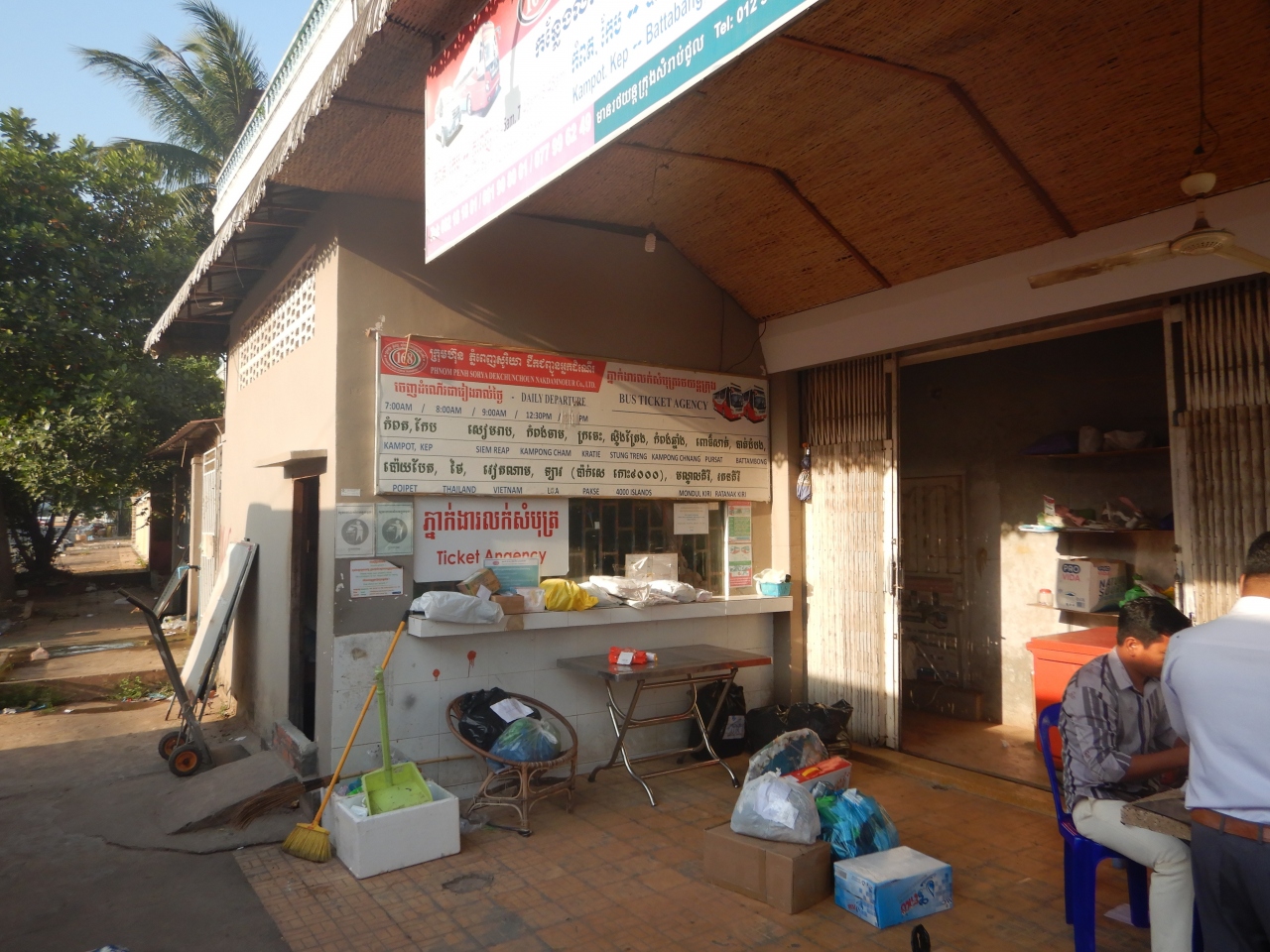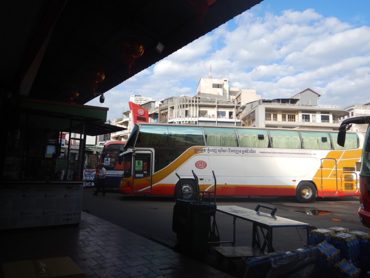 プノンペンからカンポットまでの料金は7,5$。前日に窓口で、発車時刻と料金を教えてもらっていたので安心していた。バスの車体自体はかなり古いもので、時間もそれなりにかかる。バスターミナルにはコンビニ風の売店があり、サンドイッチや飲み物を買うことができる。