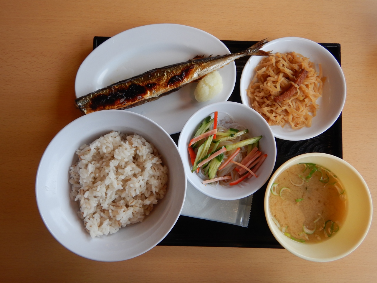 サンマの干物定食。米7割、麦3割のご飯が特徴。春雨、切干大根の煮つけ、みそ汁。それなりに美味しかった。- 旅行時期