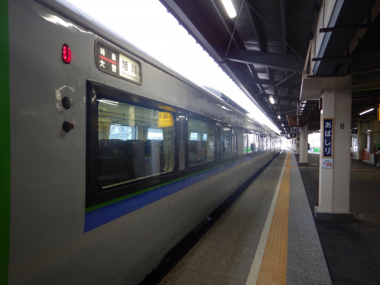 普段は特急などあまり乗らないが、今回は特急の自由席に追加料金なしで乗れる「バニラエアひがし北海道フリーパス」持っているので、乗車した。網走発8時06分、旭川到着11時50分。約4時間ほどで到着した。JR北海道では車内販売が廃止されたので、特急乗車時でも事前に飲み物や食事を購入しておかなければならないのは寂しい。