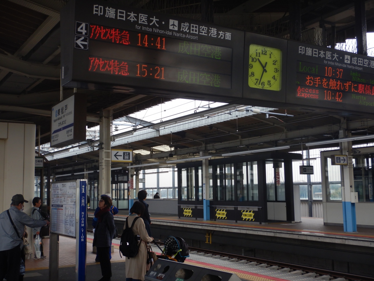 東松戸で武蔵野線から北総線に乗り換える。東松戸~成田空港を40分ほどで結んでいる。京成関屋から京成線を利用した方が少し安いが、こちらの方が時間がかからないので利用している。ただ日中は列車本数が40分に1本程度しかないので、時刻を確認しておく必要がある。