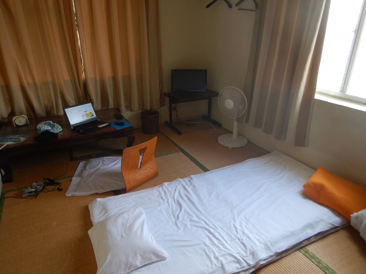 ドミトリー1泊1000円と安く泊まれた。ゲストハウス自体は雑居ビルの部屋にベッドを並べたという印象。ベッドの下段と上段との間隔が狭く、起き上がると頭がぶつかってしまうので、上段に変更してもらった。共有スペースは1階にあったが、会議室のような長テーブルとパイプ椅子が置いてある。まあ、値段相応の宿なんで特に文句はない。