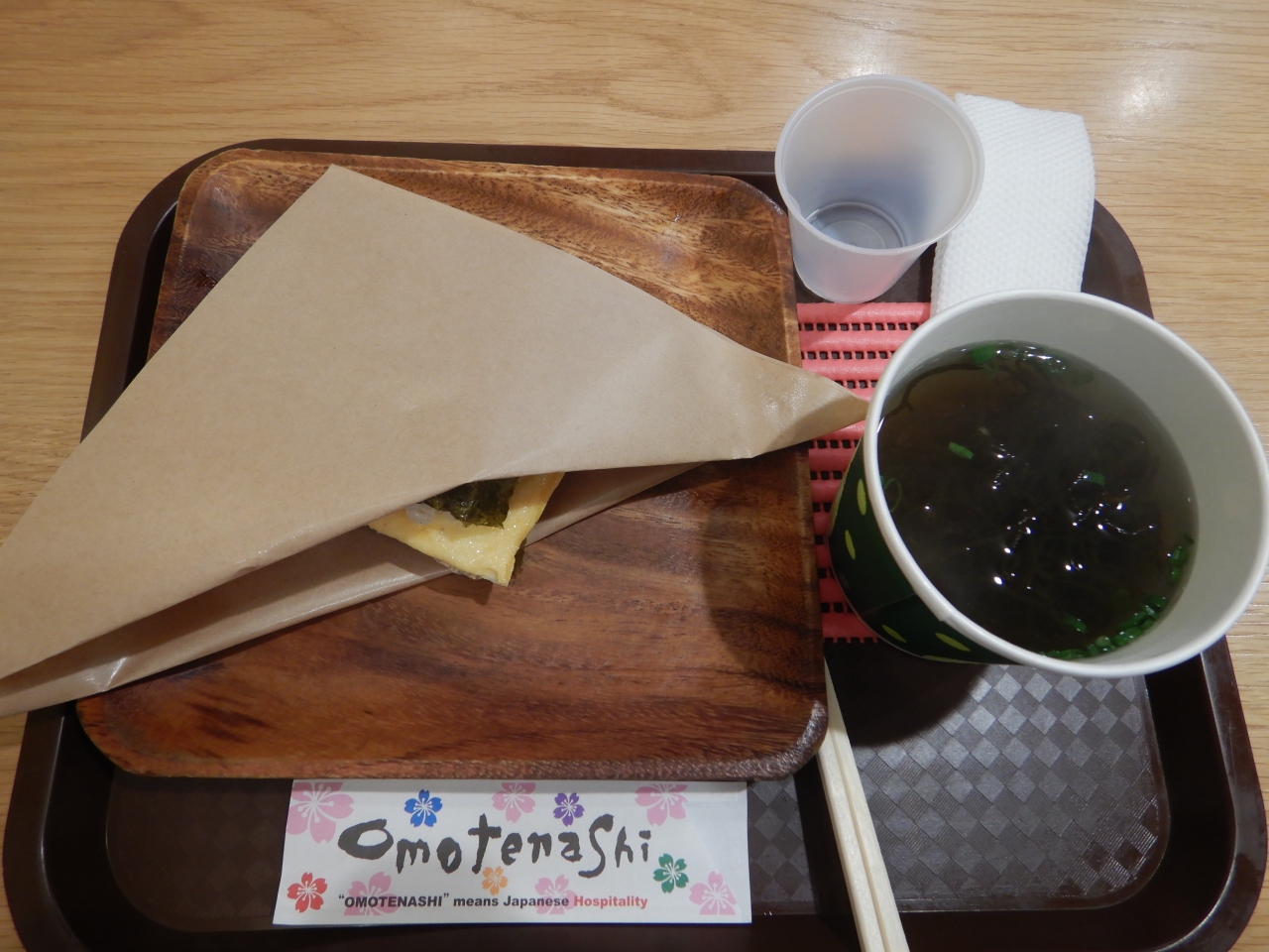 朝あまり人が並んでいなかったので、朝食として食べることにした。ポークたまご250円。もずくスープ200円をイートインコーナーで食べる。明太子入り280円はテイクアウトした。この店のお客さんはほとんどテイクアウトするが、出来立てを温かいうちに食べる方が絶対においしい。