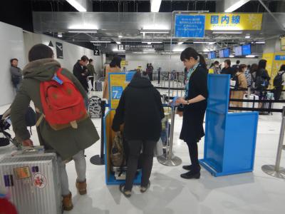 連絡バスを降りてエスカレーターで登ると第3ターミナルの入り口だ。今回はバニラエアで新千歳に行く。自動チェックイン機で搭乗券を受け取り、荷物を計量し、保安検査場に向かう。今ピーチの機内持ち込みの荷物の重量がどうなっているかわからないが、この時、バニラは1kg以下は切り捨てで7.9kgまでならOKだった。