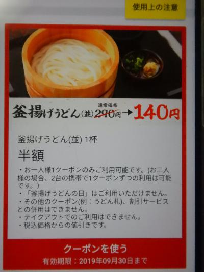 アプリのクーポンで釜揚げうどん(並)が半額で食べられた