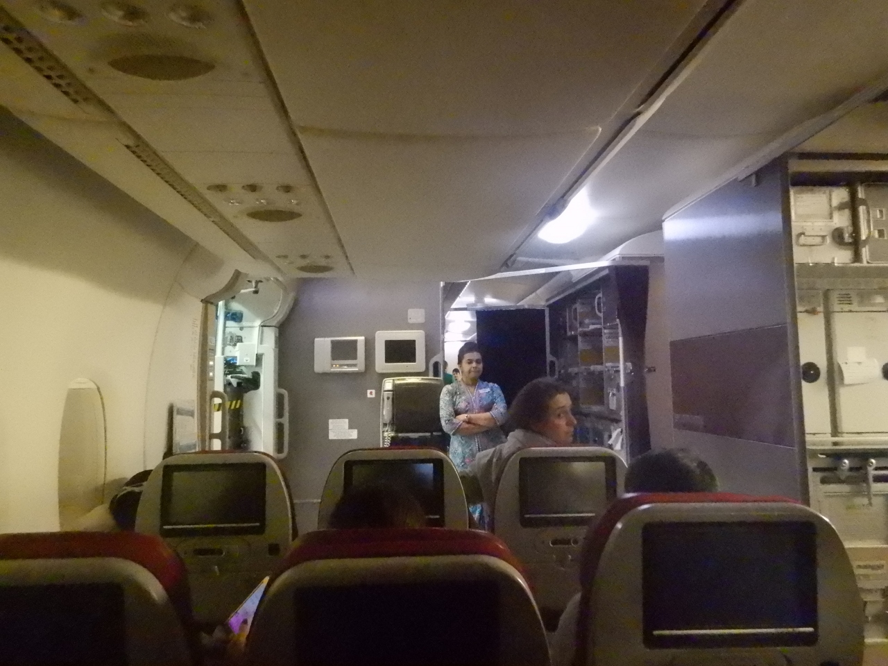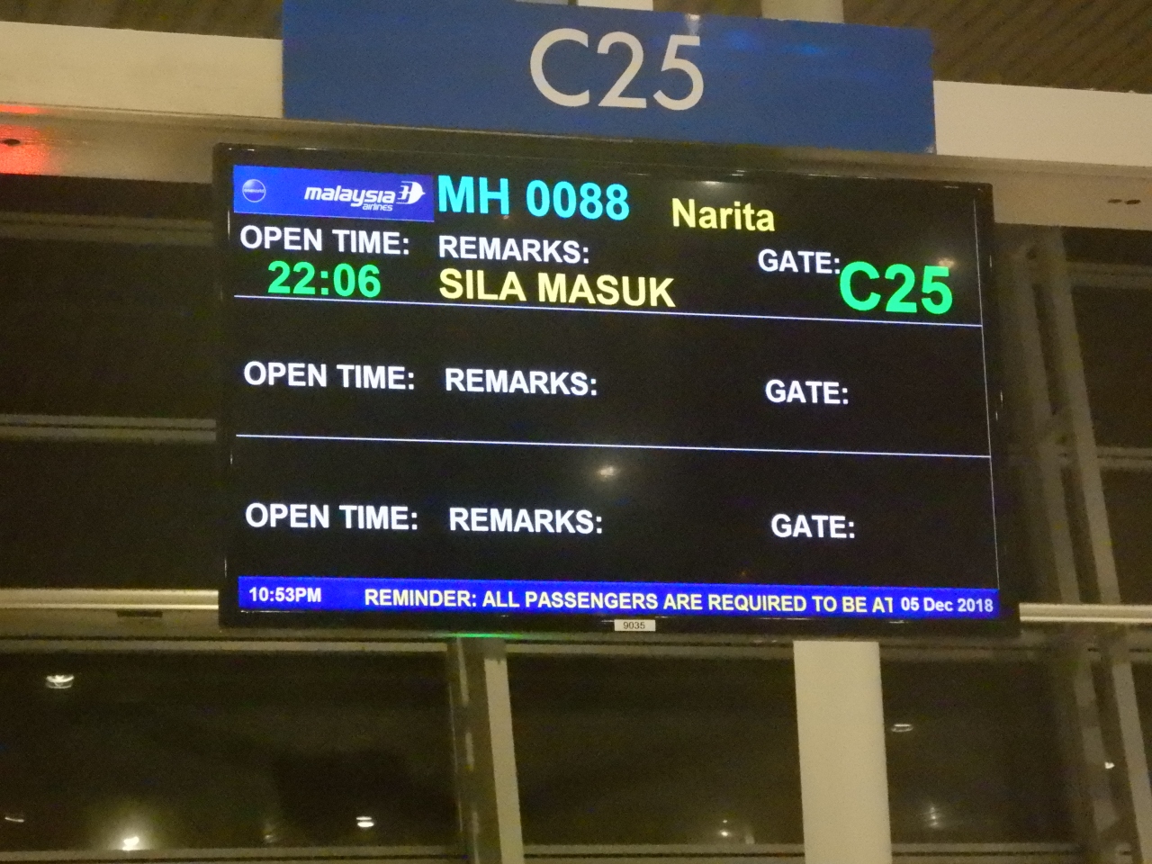12月5日クアラルンプール発23時35分のMH88便に乗る。最新機材のエアバスA380にもかかわらず、トイレのドアは壊れたまま。エンタメも使えない。そのうち機内の照明が消える。離陸から1時間以上過ぎたころに「電気系統の故障のためクアラルンプール空港の戻る」とのアナウンス。空港に到着、乗客は機内にいるままで修理が行われる。しかし30分以上も待たされたれ、結局この日は欠航となる。