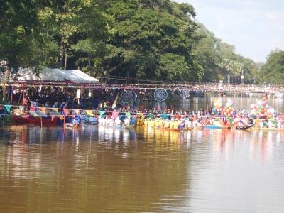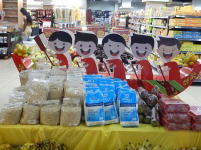 コンビニで買うより、いくらかビールが安いので時々買いに来る。ラッキーモールの建物には開業10周年を祝う飾りがあった。ラッキースーパーの店内には水祭りで行われたボートレースを模した飾りがあった。この飾りの男の子たちの顔が意外にかわいかった。