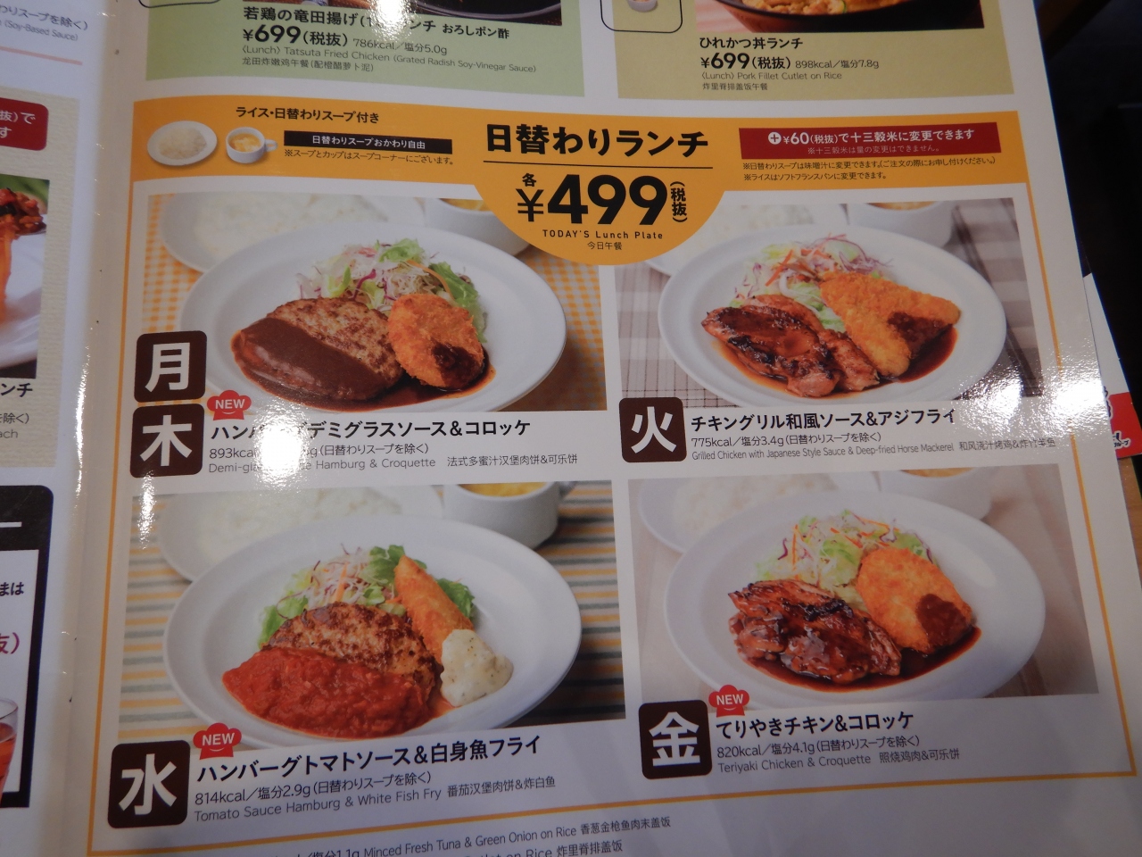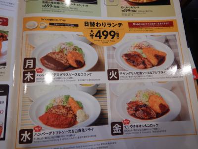 ビルの2階に店舗がある。エレベーターを降りると店の中だ。この日は日替わりランチを食べてみた。この日は火曜日なので「チキングリル和風ソース&アジフライ」だった。鶏肉は柔らかく食べやすかった。499円+税なら十分だろう。すかいらーくグループでは読売新聞を無料で配布しているので、頼んだら座席まで持ってきてくれたのは好印象だった。
