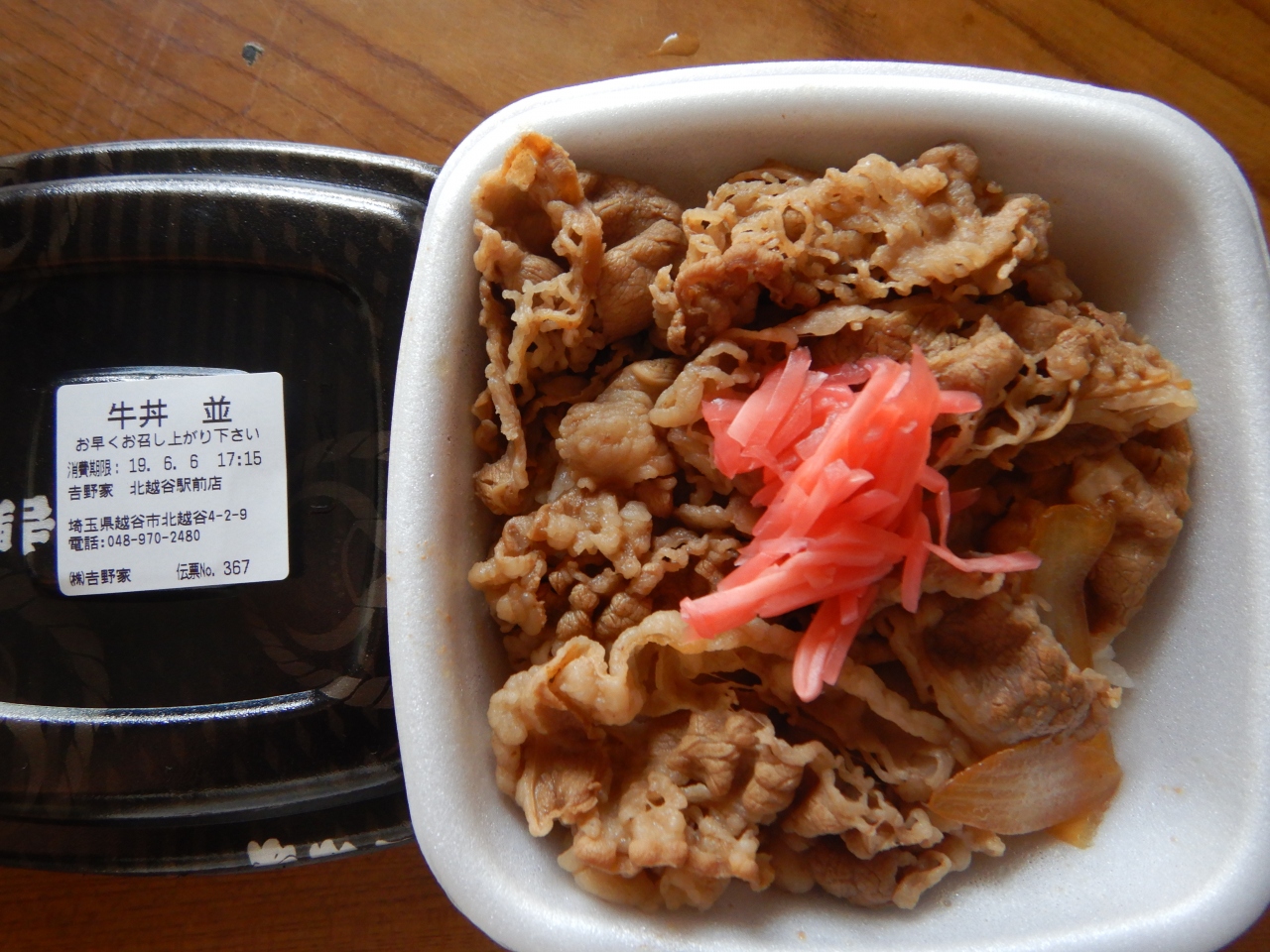 最近あまり行ったことがない北越谷店に行ってみたら、テイクアウト80円引きの幟が立っていた。店内で食べるつもりだったが、80円引きならテイクアウトし、自宅で食べることにした。紅ショウガと七味唐辛子付。株主優待券300円分を使用し、現金負担はゼロだった。
