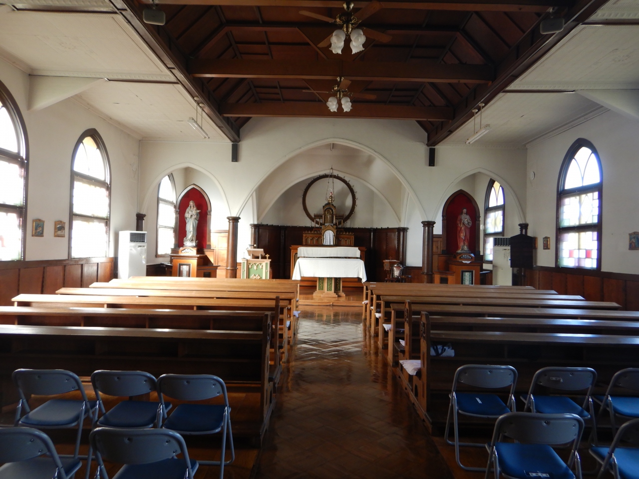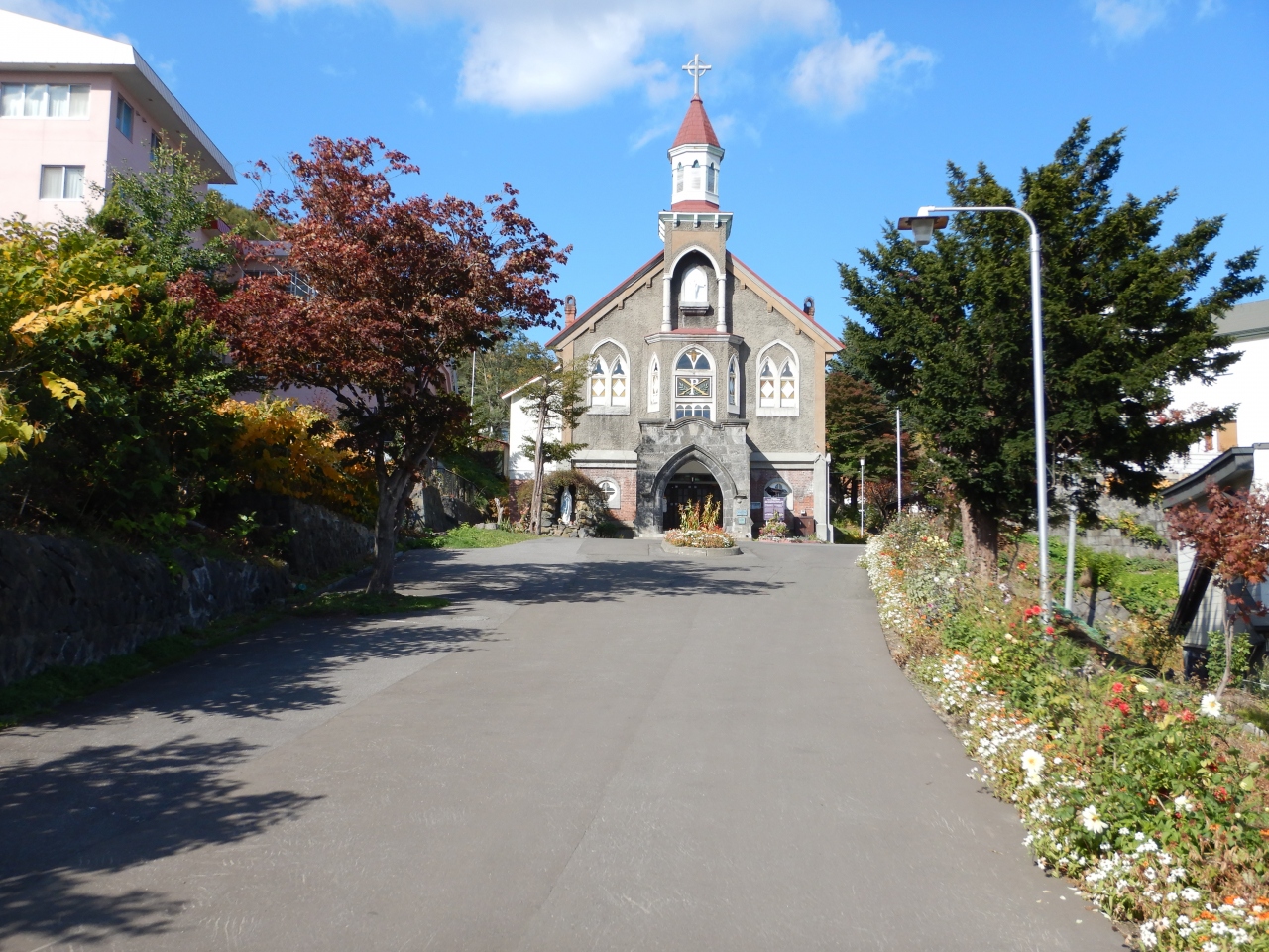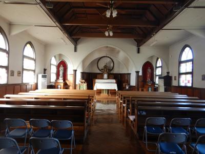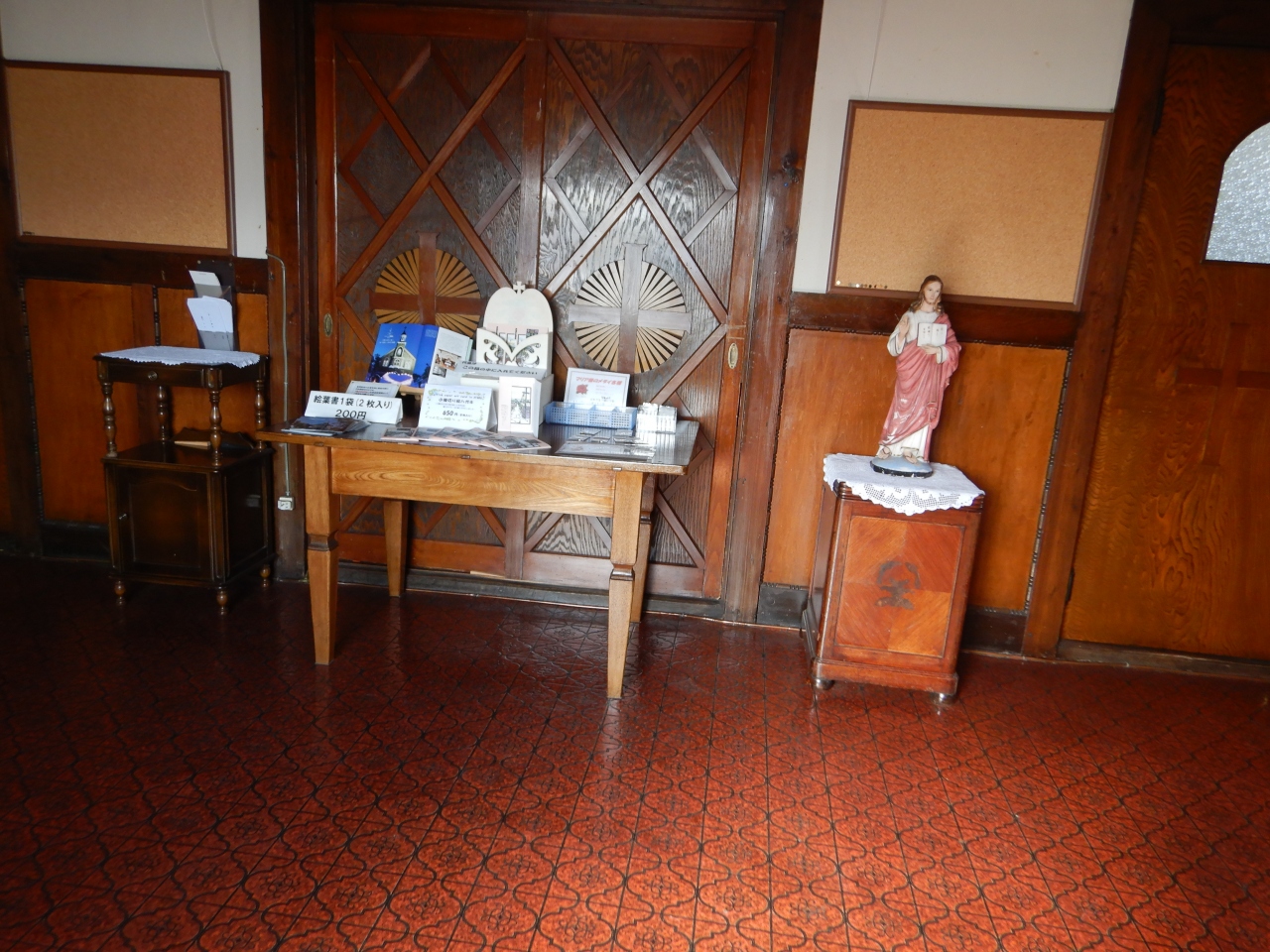 前回来た時は聖堂の中に入れるのを知らずに、聖堂を外から見ただけだったので、今回は入ってみた。訪れる人は私以外にはいなかったので、静かでよかった。入口の扉の前には絵葉書の無人販売。聖堂の正面の左右にはマリア像とキリストの像。キリスト教徒ではない私でも身が引き締まる思いをした。