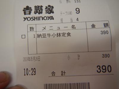 朝食に新メニューがいくつかあった。そのうちの納豆牛小鉢定食を食べてみた。納豆、野菜サラダ、牛小鉢、みそ汁、ご飯という内容。牛丼よりも栄養のバランスがよさそうだ。それで値段は390円と牛丼と10円しか差がない。朝食のメニューなので午前11時までしか提供されていないがのが残念なところだ。