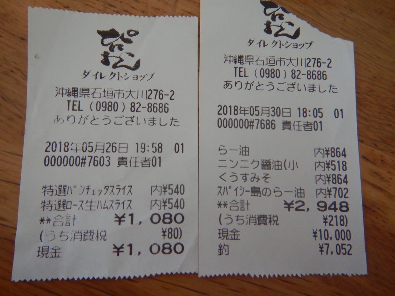 石垣と来るとここは外せない。今回は1度目は滞在中のビールのつまみに「特選パンチェッタスライス」「特選生ロースハム」を買う。翌日にはもう食べ終わっていた。帰る前日には自宅の土産用に調味料など(らー油、ニンニク醤油、くうすみそなど)を買って帰った。中には使ってみてこれは失敗だったと思う物もあるが、くうすみそは外せない。ただ、クレジットカードが使えず、現金払いのみ点は何とかしてほしい。