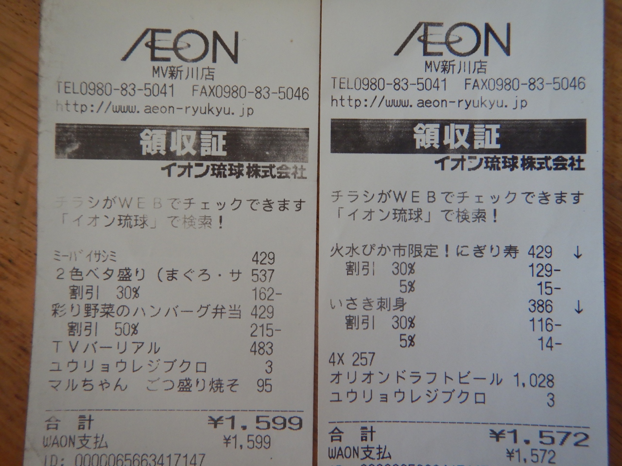 24時間営業のスーパーなので気が向いた時にいつでも買いに行けるのがよい。今回はビール類を中心に沖縄の魚である「ミーバイの刺身」「いさき刺身」「にぎり寿司」などを買ってみた。午後8時を過ぎると割引になる商品があるのはよい。