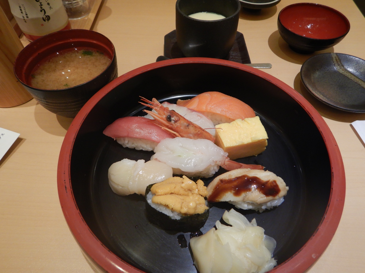 鮨は中トロ、エビ、タイ、ウニ、サーモン、ホタテ、アナゴ。どれも美味しかった。ただ支払いが終わったあとレシートを渡してくれなった。- 旅行時期